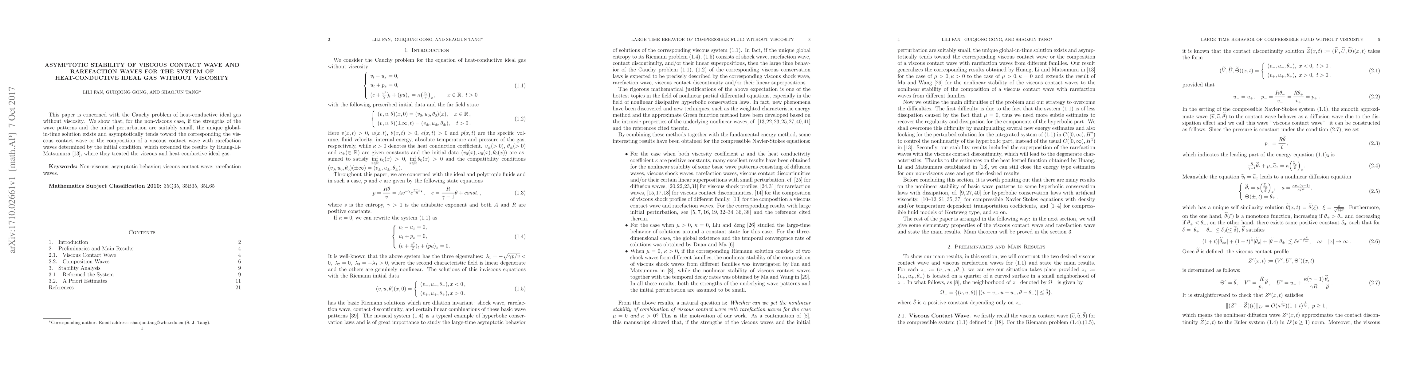 This paper shows that for heat-conductive ideal gas without viscosity, small initial perturbations lead to unique global-in-time solutions that asymptotically tend toward specific wave patterns.