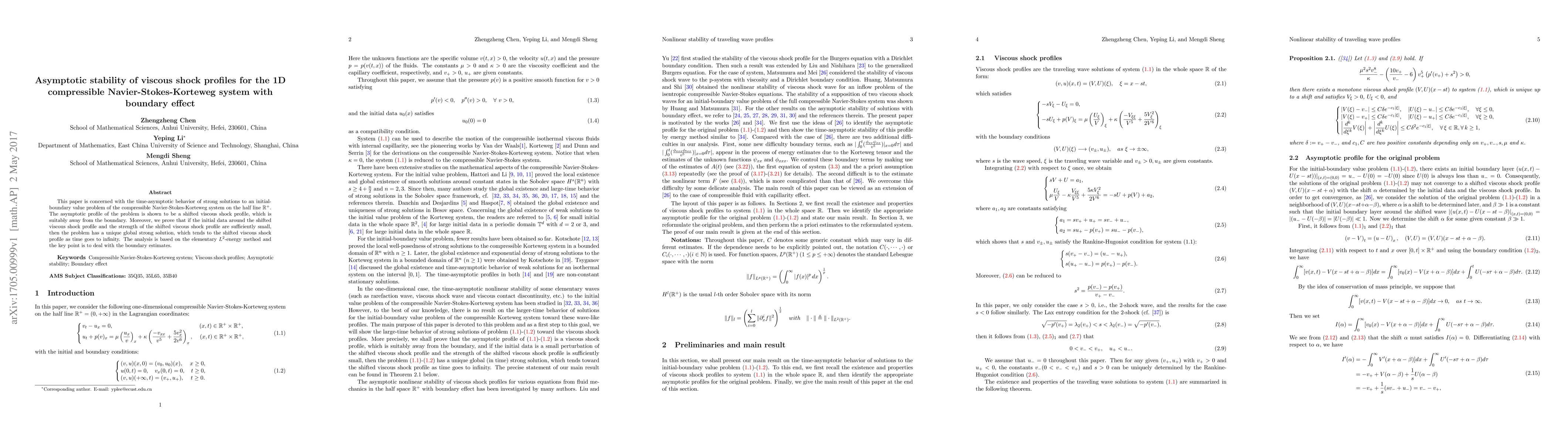 This paper investigates the asymptotic stability of shifted viscous shock profiles for the 1D compressible Navier-Stokes-Korteweg system with boundary effects. It demonstrates that under small initial perturbations, solutions converge to these profiles as time approaches infinity, using the $L^2$-energy method and addressing boundary conditions.