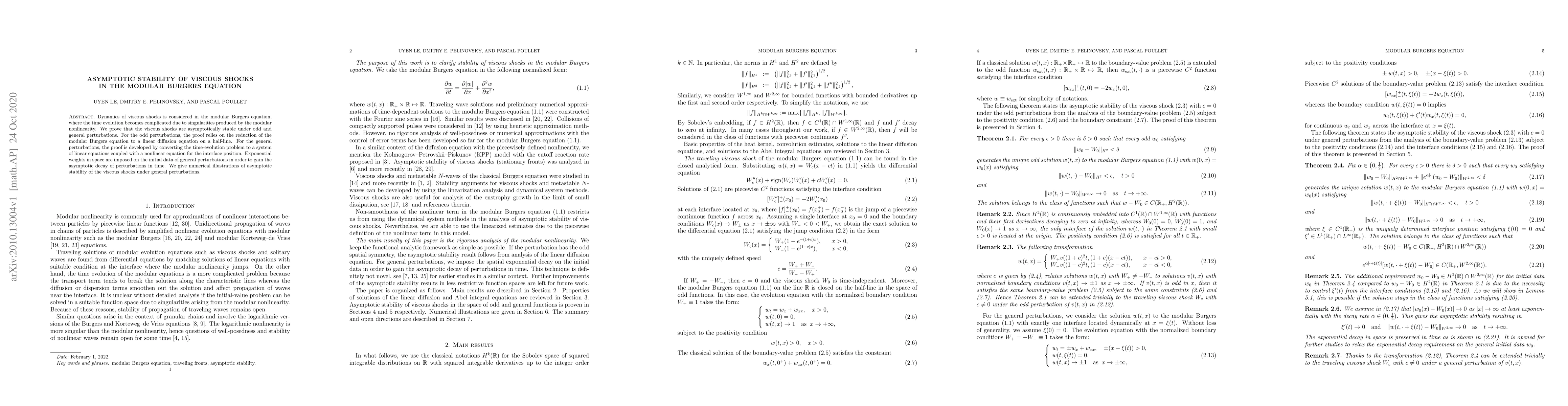 This paper proves the asymptotic stability of viscous shocks in the modular Burgers equation under both odd and general perturbations. It employs different methods for each type of perturbation, including reduction to a linear diffusion equation and conversion to a system of linear equations, with exponential weights for initial data to ensure decay over time. Numerical illustrations are provided to demonstrate the stability.