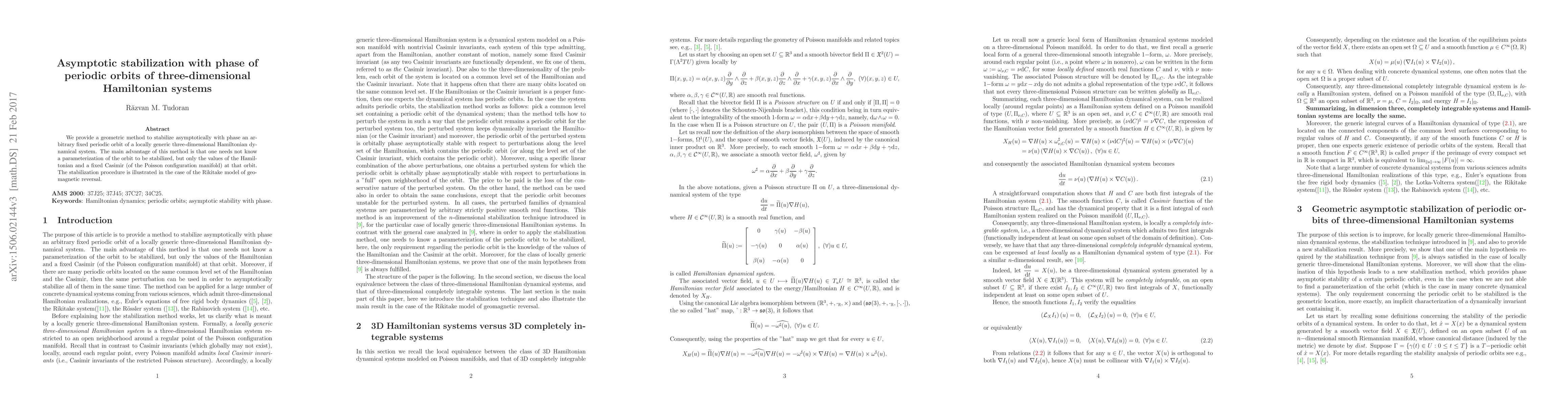 We provide a geometric method to stabilize asymptotically with phase an arbitrary fixed periodic orbit of a locally generic three-dimensional Hamiltonian dynamical system. The main advantage of this method is that one needs not know a parameterization of the orbit to be stabilized, but only the values of the Hamiltonian and a fixed Casimir (of the Poisson configuration manifold) at that orbit. The stabilization procedure is illustrated in the case of the Rikitake model of geomagnetic reversal.