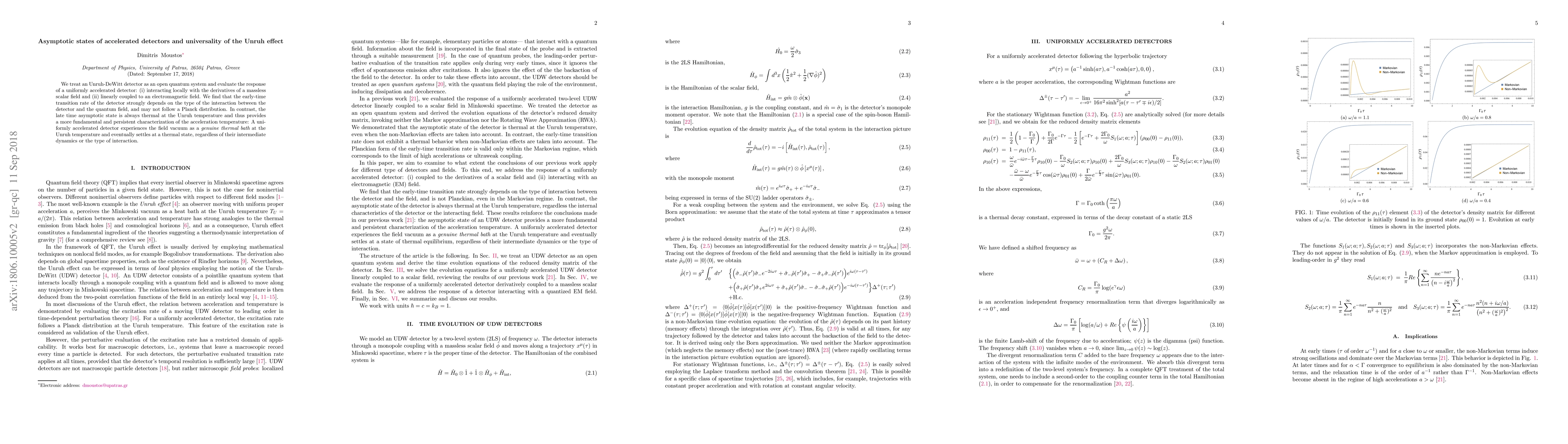 This paper explores the asymptotic behavior of uniformly accelerated Unruh-DeWitt detectors interacting with quantum fields, finding that early-time responses vary with interaction type but late-time states universally settle at a thermal state at the Unruh temperature, indicating a fundamental thermal characterization of acceleration.