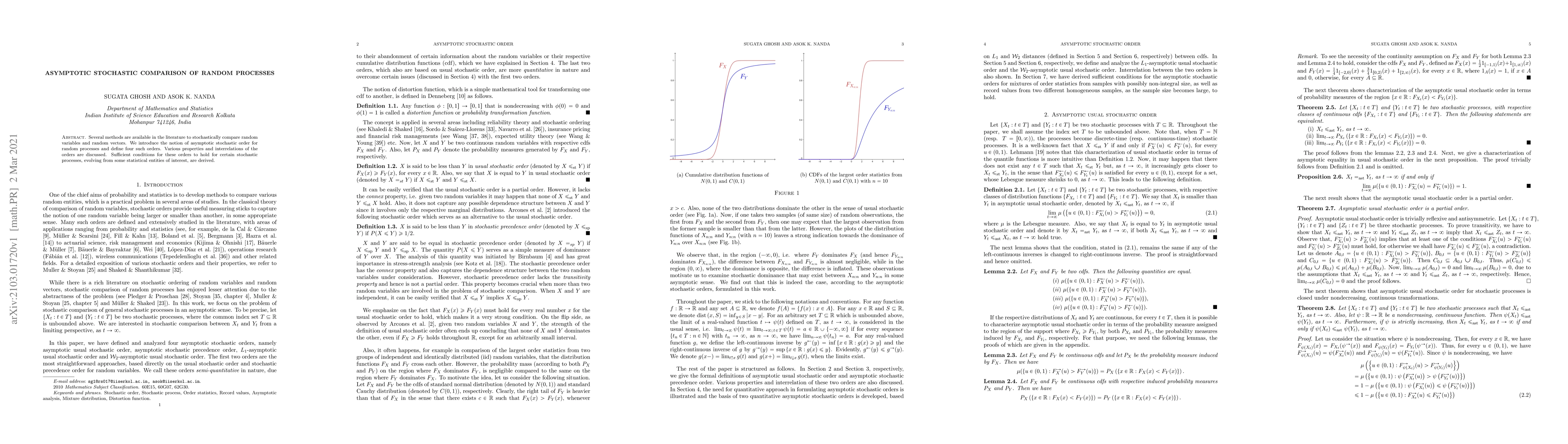 This paper introduces asymptotic stochastic orders for random processes, defining four types of order relations and deriving sufficient conditions for these relationships. It provides a framework for stochastically comparing various stochastic processes.