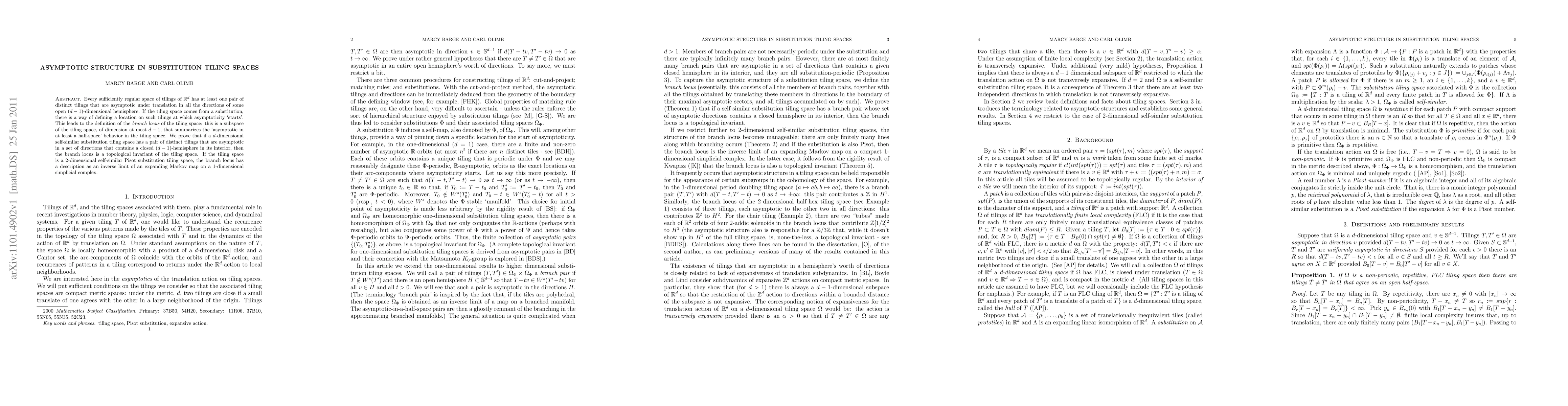 Every sufficiently regular space of tilings of $\R^d$ has at least one pair of distinct tilings that are asymptotic under translation in all the directions of some open $(d-1)$-dimensional hemisphere. If the tiling space comes from a substitution, there is a way of defining a location on such tilings at which asymptoticity `starts'. This leads to the definition of the {\em branch locus} of the tiling space: this is a subspace of the tiling space, of dimension at most $d-1$, that summarizes the `asymptotic in at least a half-space' behavior in the tiling space. We prove that if a $d$-dimensional self-similar substitution tiling space has a pair of distinct tilings that are asymptotic in a set of directions that contains a closed $(d-1)$-hemisphere in its interior, then the branch locus is a topological invariant of the tiling space. If the tiling space is a 2-dimensional self-similar Pisot substitution tiling space, the branch locus has a description as an inverse limit of an expanding Markov map on a 1-dimensional simplicial complex.