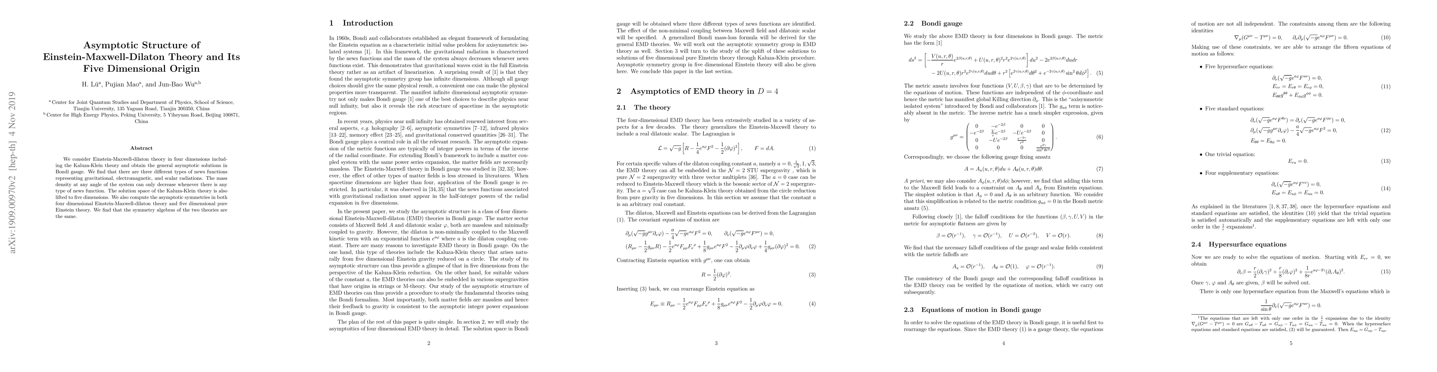 We consider Einstein-Maxwell-dilaton theory in four dimensions including the Kaluza-Klein theory and obtain the general asymptotic solutions in Bondi gauge. We find that there are three different types of news functions representing gravitational, electromagnetic, and scalar radiations. The mass density at any angle of the system can only decrease whenever there is any type of news function. The solution space of the Kaluza-Klein theory is also lifted to five dimensions. We also compute the asymptotic symmetries in both four dimensional Einstein-Maxwell-dilaton theory and five dimensional pure Einstein theory. We find that the symmetry algebras of the two theories are the same.