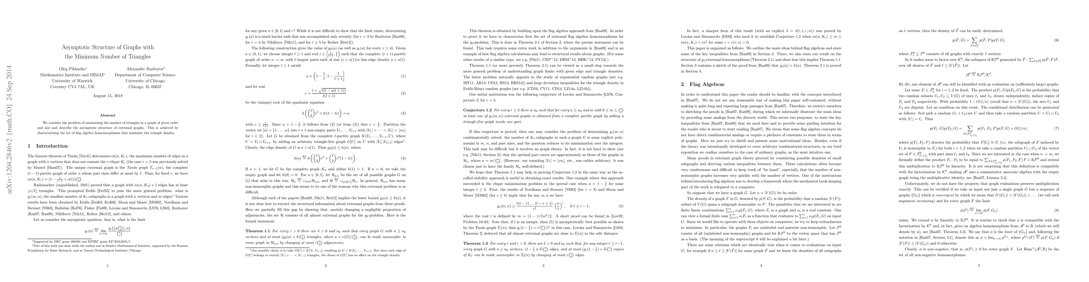 We consider the problem of minimizing the number of triangles in a graph of given order and size and describe the asymptotic structure of extremal graphs. This is achieved by characterizing the set of flag algebra homomorphisms that minimize the triangle density.