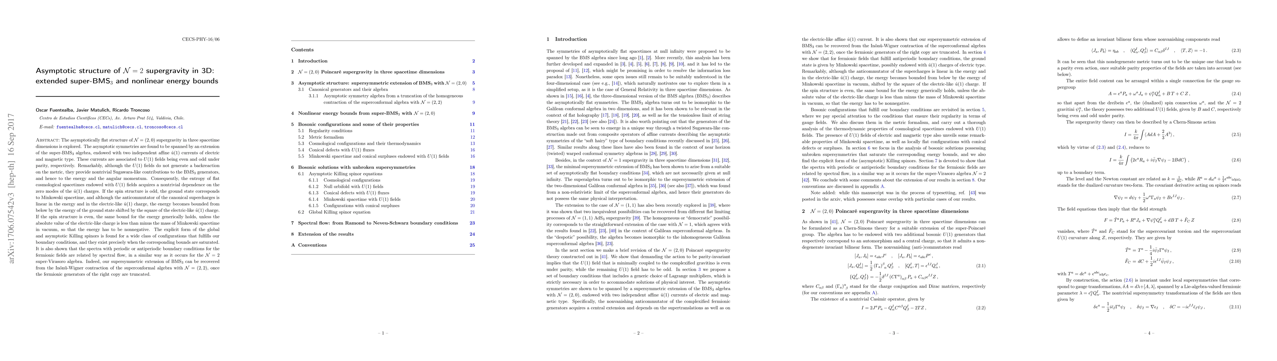 The asymptotically flat structure of $\mathcal{N}=(2,0)$ supergravity in three spacetime dimensions is explored. The asymptotic symmetries are spanned by an extension of the super-BMS$_3$ algebra, with two independent $\hat{u}(1)$ currents of electric and magnetic type. These currents are associated to $U(1)$ fields being even and odd under parity, respectively. Remarkably, although the $U(1)$ fields do not generate a backreaction on the metric, they provide nontrivial Sugawara-like contributions to the BMS$_3$ generators, and hence to the energy and the angular momentum. The entropy of flat cosmological spacetimes with $U(1)$ fields then acquires a nontrivial dependence on the $\hat{u}(1)$ charges. If the spin structure is odd, the ground state corresponds to Minkowski spacetime, and although the anticommutator of the canonical supercharges is linear in the energy and in the electric-like $\hat{u}(1)$ charge, the energy becomes bounded from below by the energy of the ground state shifted by the square of the electric-like $\hat{u}(1)$ charge. If the spin structure is even, the same bound for the energy generically holds, unless the absolute value of the electric-like charge is less than minus the mass of Minkowski spacetime in vacuum, so that the energy has to be nonnegative. The explicit form of the Killing spinors is found for a wide class of configurations that fulfills our boundary conditions, and they exist precisely when the corresponding bounds are saturated. It is also shown that the spectra with periodic or antiperiodic boundary conditions for the fermionic fields are related by spectral flow, in a similar way as it occurs for the $\mathcal{N}=2$ super-Virasoro algebra. Indeed, our super-BMS$_3$ algebra can be recovered from the flat limit of the superconformal algebra with $\mathcal{N}=(2,2)$, truncating the fermionic generators of the right copy.