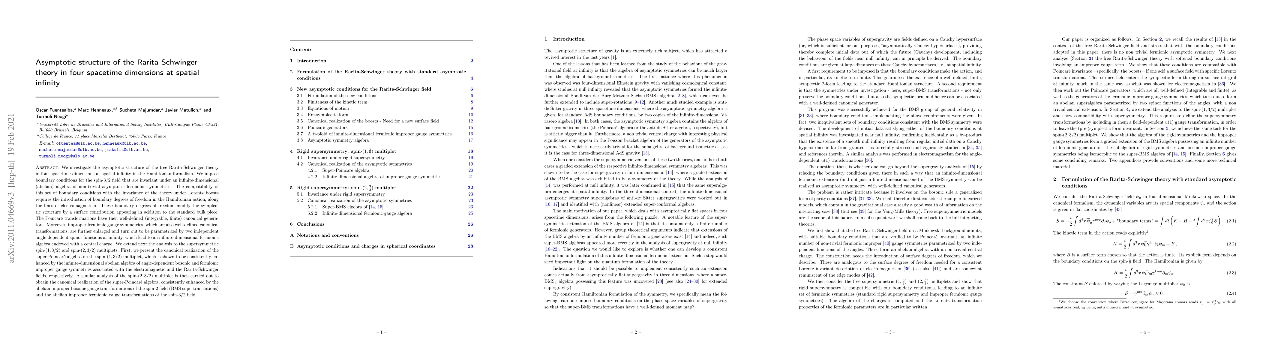 This paper explores the asymptotic structure of the free Rarita-Schwinger theory in four spacetime dimensions, introducing boundary conditions that maintain invariance under Lorentz boosts and reveal an infinite-dimensional fermionic algebra with a central charge. The study extends to supersymmetric spin-$(1,3/2)$ and spin-$(2,3/2)$ multiplets, showing consistent enhancements through improper gauge symmetries.