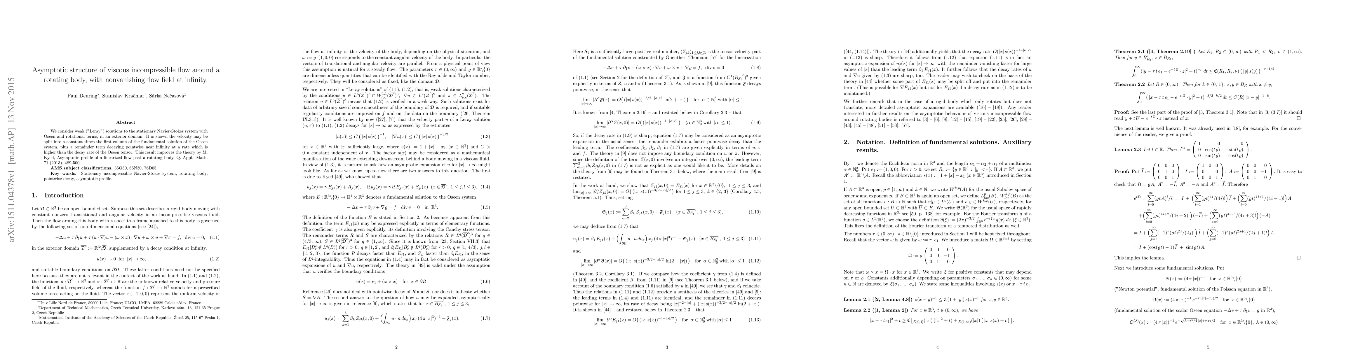 This paper explores the asymptotic structure of viscous incompressible flow around a rotating body, demonstrating that the velocity can be decomposed into a leading term and a decaying remainder. This improves upon previous results by showing a higher decay rate for the remainder term.