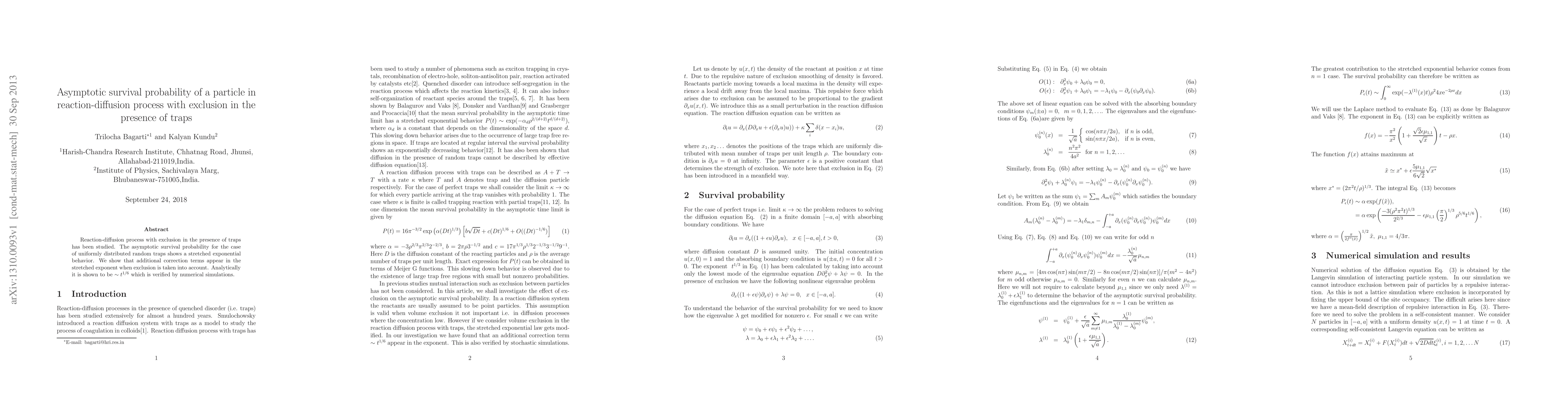 This paper investigates the asymptotic survival probability in a reaction-diffusion process with exclusion and traps, revealing a stretched exponential behavior. Analytical and numerical results show that exclusion introduces correction terms in the stretched exponent, which is found to be ∼t^(1/6).