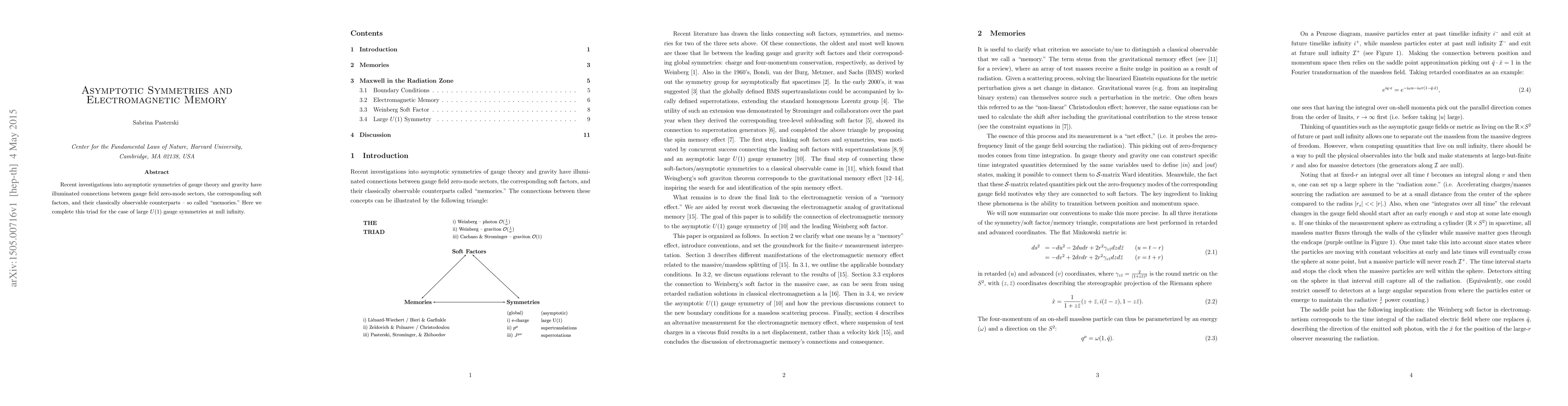 This research paper explores connections between asymptotic symmetries in gauge theory and gravity, specifically focusing on large U(1) gauge symmetries at null infinity, and how they relate to 'memories' observable at a classical level.
