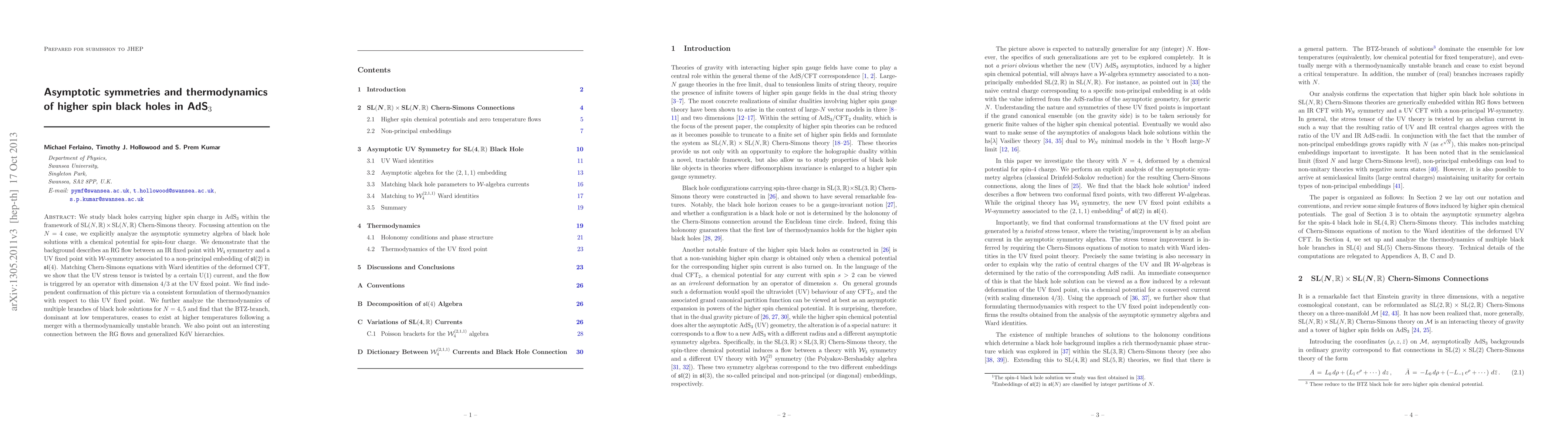 We study black holes carrying higher spin charge in AdS3 within the framework of SL(N, R) x SL(N, R) Chern-Simons theory. Focussing attention on the N=4 case, we explicitly analyze the asymptotic symmetry algebra of black hole solutions with a chemical potential for spin-four charge. We demonstrate that the background describes an RG flow between an IR fixed point with W_4 symmetry and a UV fixed point with W-symmetry associated to a non-principal embedding of sl(2) in sl(4). Matching Chern-Simons equations with Ward identities of the deformed CFT, we show that the UV stress tensor is twisted by a certain U(1) current, and the flow is triggered by an operator with dimension 4/3 at the UV fixed point. We find independent confirmation of this picture via a consistent formulation of thermodynamics with respect to this UV fixed point. We further analyze the thermodynamics of multiple branches of black hole solutions for N=4,5 and find that the BTZ-branch, dominant at low temperatures, ceases to exist at higher temperatures following a merger with a thermodynamically unstable branch. We also point out an interesting connection between the RG flows and generalized KdV hierarchies.