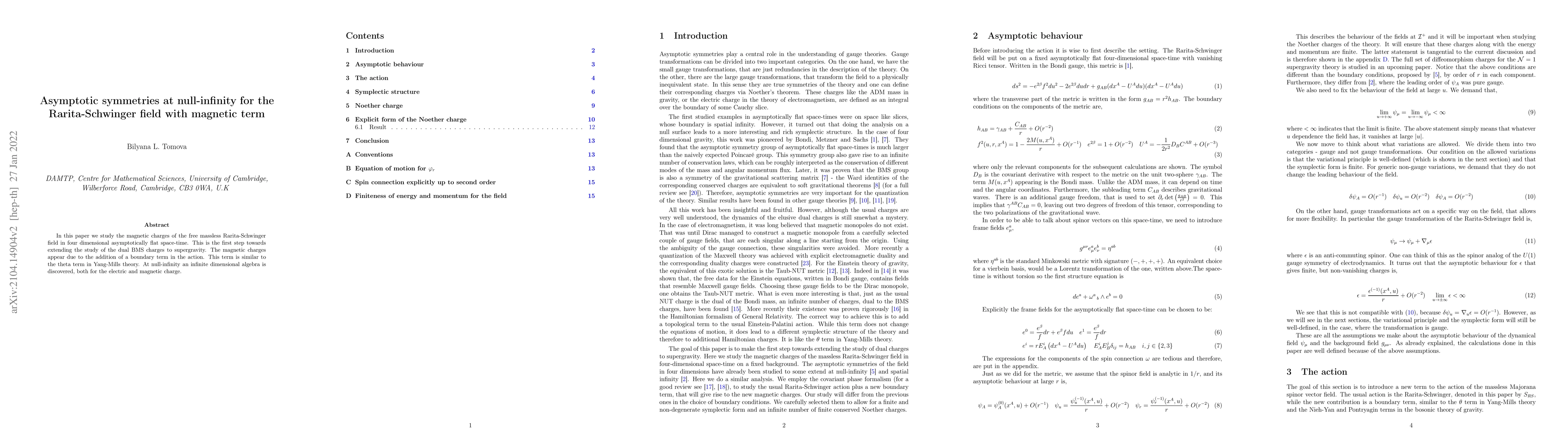 This paper investigates the magnetic charges of the free massless Rarita-Schwinger field in four-dimensional asymptotically flat space-time, revealing an infinite-dimensional algebra at null-infinity, akin to the dual BMS charges in supergravity. The magnetic charges emerge from a boundary term in the action, comparable to the theta term in Yang-Mills theory.