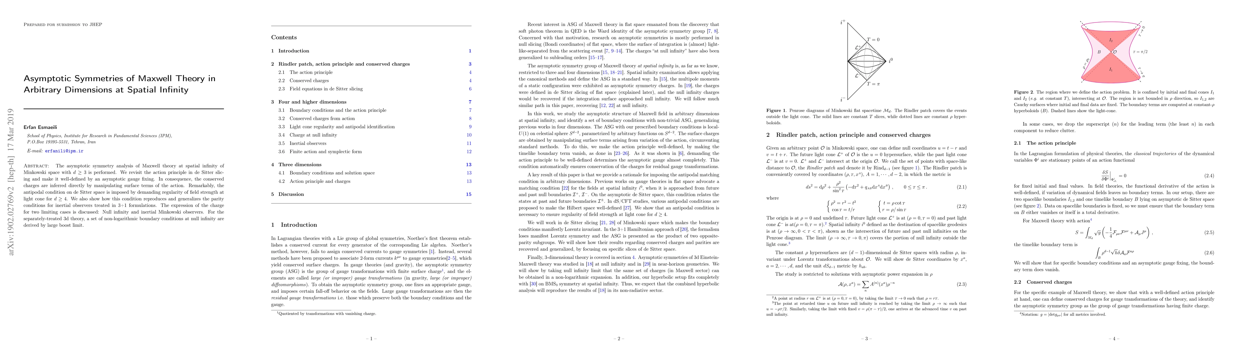 The asymptotic symmetry analysis of Maxwell theory at spatial infinity of Minkowski space with $d\geq 3$ is performed. We revisit the action principle in de Sitter slicing and make it well-defined by an asymptotic gauge fixing. In consequence, the conserved charges are inferred directly by manipulating surface terms of the action. Remarkably, the antipodal condition on de Sitter space is imposed by demanding regularity of field strength at light cone for $d\geq 4$. We also show how this condition reproduces and generalizes the parity conditions for inertial observers treated in 3+1 formulations. The expression of the charge for two limiting cases is discussed: Null infinity and inertial Minkowski observers. For the separately-treated 3d theory, a set of non-logarithmic boundary conditions at null infinity are derived by a large boost limit.