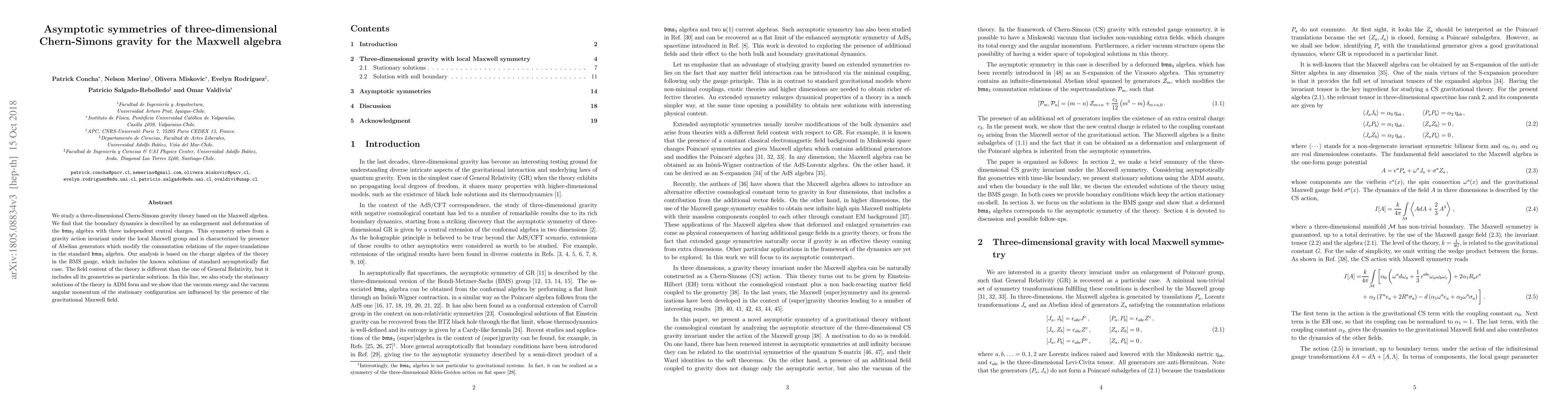 This paper investigates three-dimensional Chern-Simons gravity based on the Maxwell algebra, revealing an enlarged boundary dynamics described by a deformed $\mathfrak{bms}_3$ algebra with three central charges. The symmetry emerges from a gravity action invariant under the local Maxwell group, influencing the vacuum energy and angular momentum of stationary solutions.