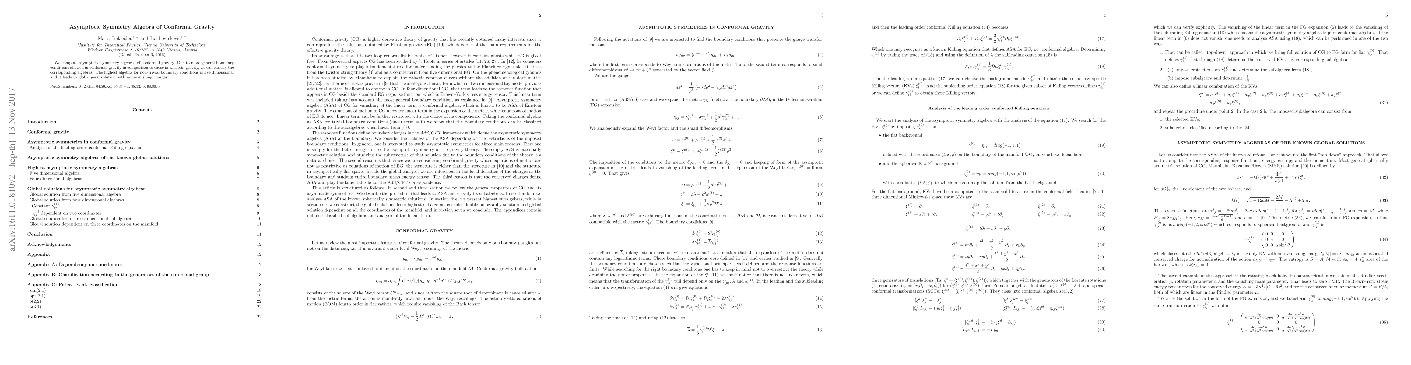 We compute asymptotic symmetry algebras of conformal gravity. Due to more general boundary conditions allowed in conformal gravity in comparison to those in Einstein gravity, we can classify the corresponding algebras. The highest algebra for non-trivial boundary conditions is five dimensional and it leads to global geon solution with non-vanishing charges.