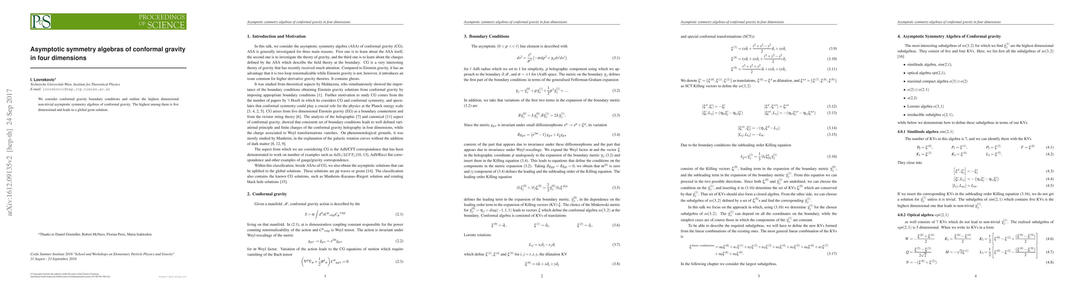 We consider conformal gravity boundary conditions and outline the highest dimensional non-trivial asymptotic symmetry algebras of conformal gravity. The highest among them is five dimensional and leads to a global geon solution.