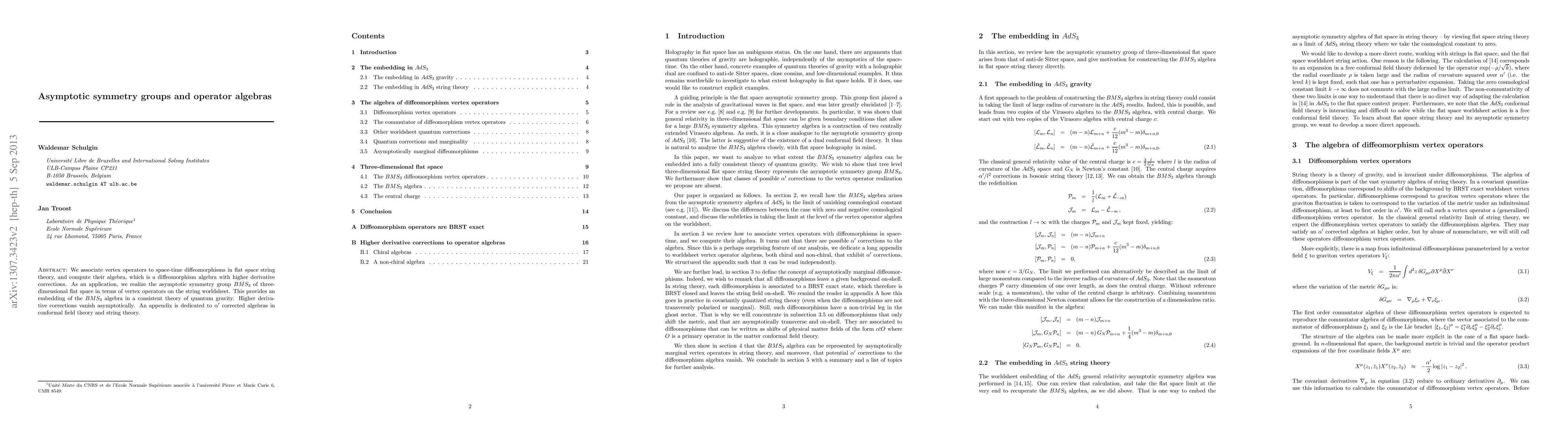 We associate vertex operators to space-time diffeomorphisms in flat space string theory, and compute their algebra, which is a diffeomorphism algebra with higher derivative corrections. As an application, we realize the asymptotic symmetry group BMS3 of three-dimensional flat space in terms of vertex operators on the string worldsheet. This provides an embedding of the BMS3 algebra in a consistent theory of quantum gravity. Higher derivative corrections vanish asymptotically. An appendix is dedicated to alpha prime corrected algebras in conformal field theory and string theory.