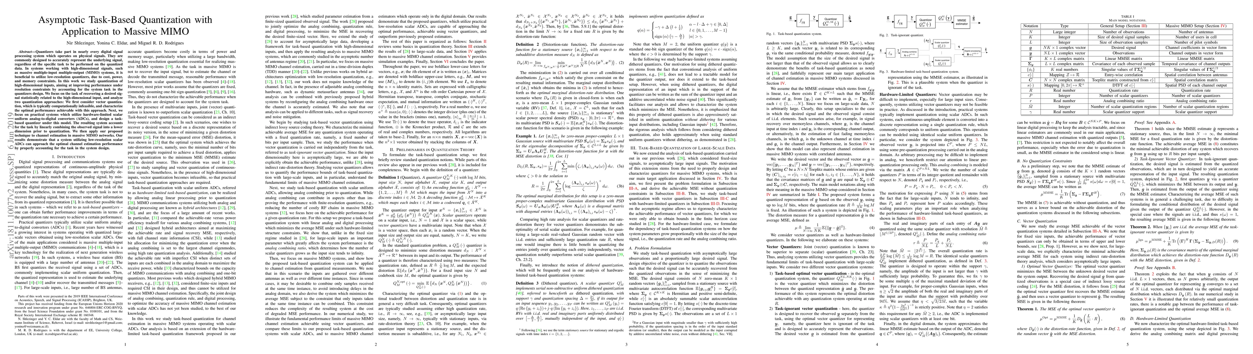 This paper investigates task-based quantization techniques for high-dimensional signals in massive MIMO systems, proposing a method that optimizes performance under resolution constraints by integrating the task into quantizer design. The study applies this approach to channel estimation in massive MIMO, showing that low-resolution ADCs can achieve near-optimal performance when the task is considered in the system design.