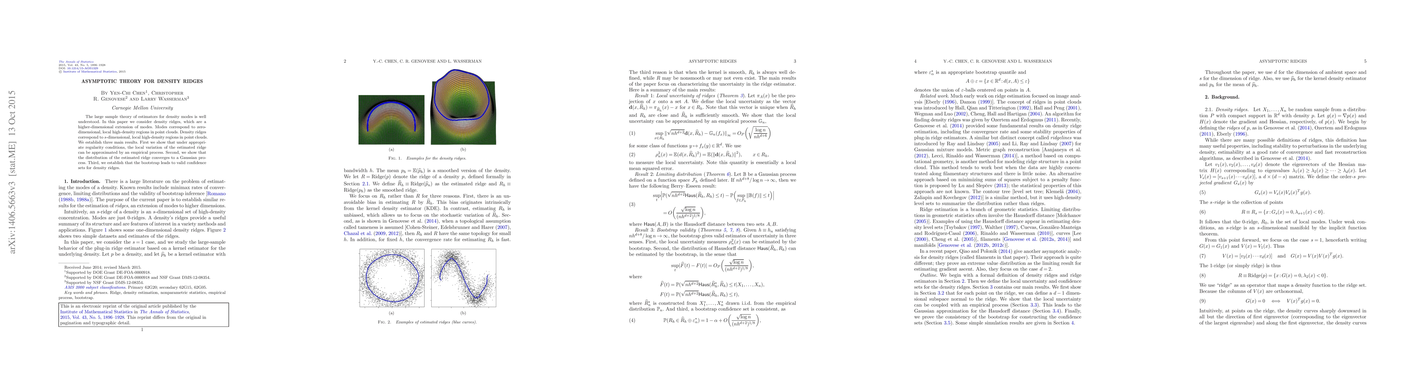 This paper develops asymptotic theory for density ridges, a higher-dimensional extension of density modes, establishing their convergence to Gaussian processes and the validity of bootstrap confidence sets.