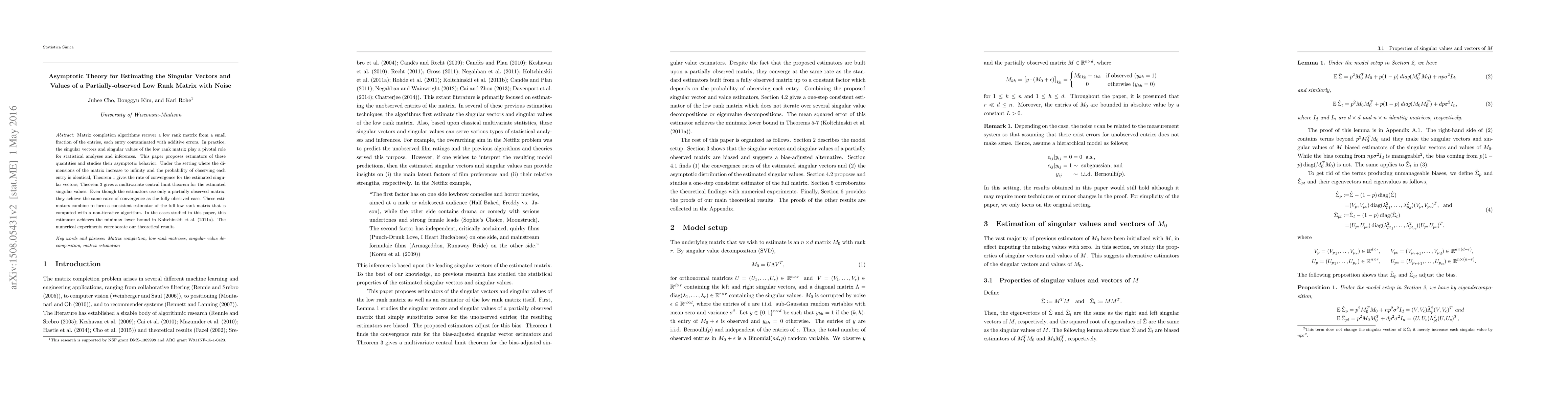 This paper proposes estimators for singular vectors and values of a partially-observed low rank matrix with noise, and studies their asymptotic behavior. The estimators achieve convergence rates comparable to fully observed cases, and a consistent estimator of the full matrix is formed with a non-iterative algorithm.