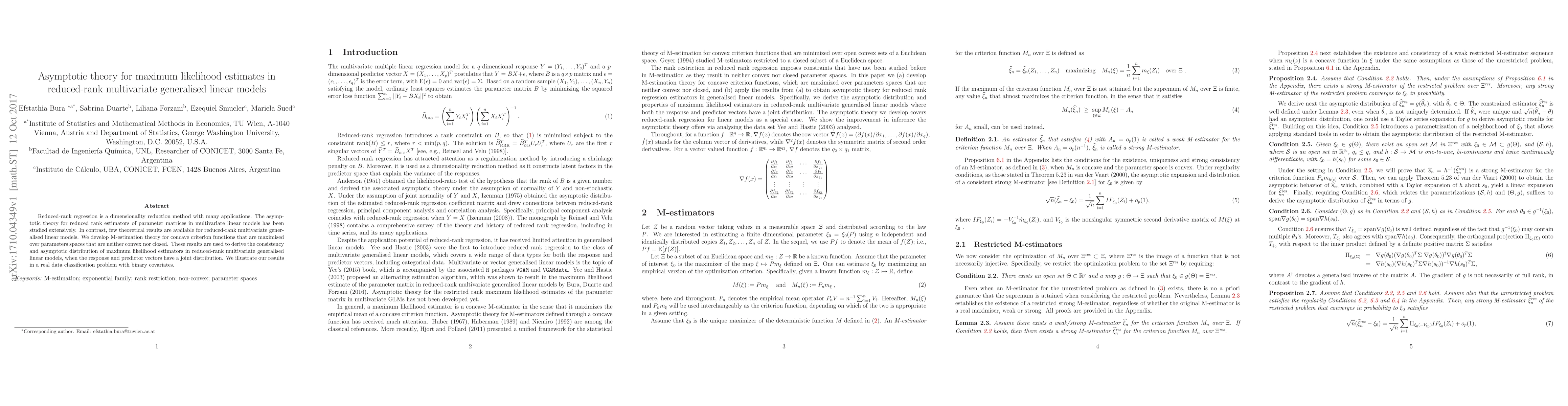 This paper develops the asymptotic theory for maximum likelihood estimates in reduced-rank multivariate generalised linear models, addressing the lack of theoretical results for such models. It introduces M-estimation theory for non-convex parameter spaces and uses it to establish the consistency and asymptotic distribution of the estimators, demonstrated through a real data classification problem.