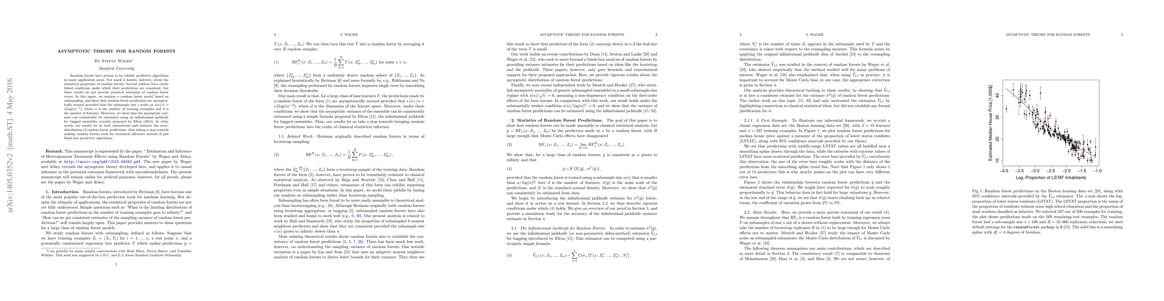 This paper investigates the statistical properties of random forests, demonstrating that their predictions are asymptotically normal under certain subsampling conditions. It also provides a method for consistently estimating the asymptotic variance using an infinitesimal jackknife, thereby enhancing the utility of random forests for statistical inference.