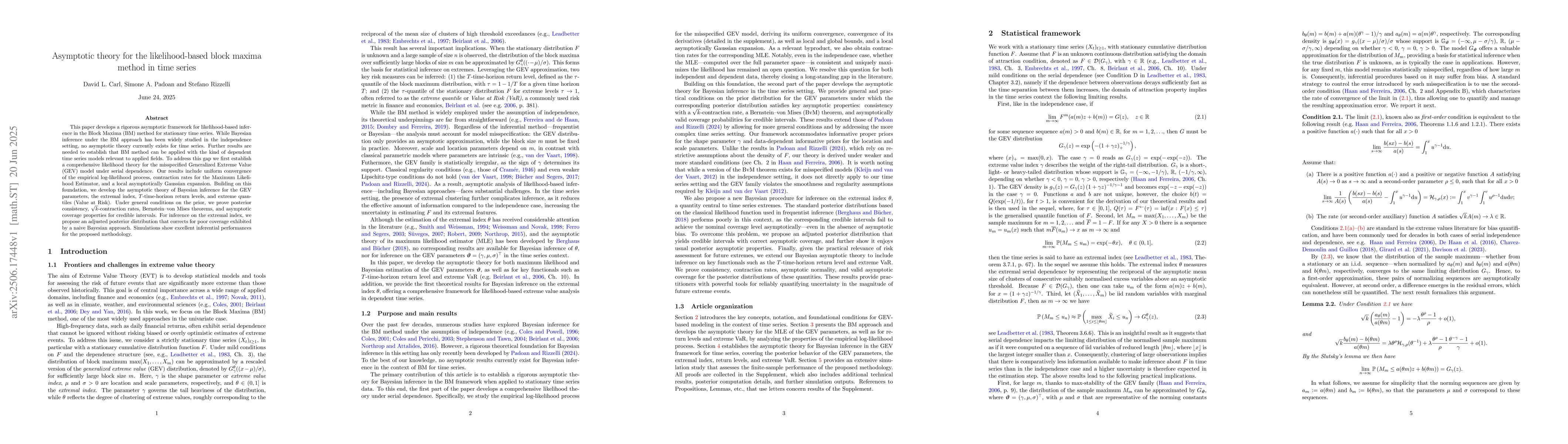 The paper's main technical contribution is the development of an asymptotic theory for Bayesian inference in the context of the Block Maxima method for time series, including contraction rates, Bernstein-von Mises theorems, and asymptotic coverage properties for credible intervals.