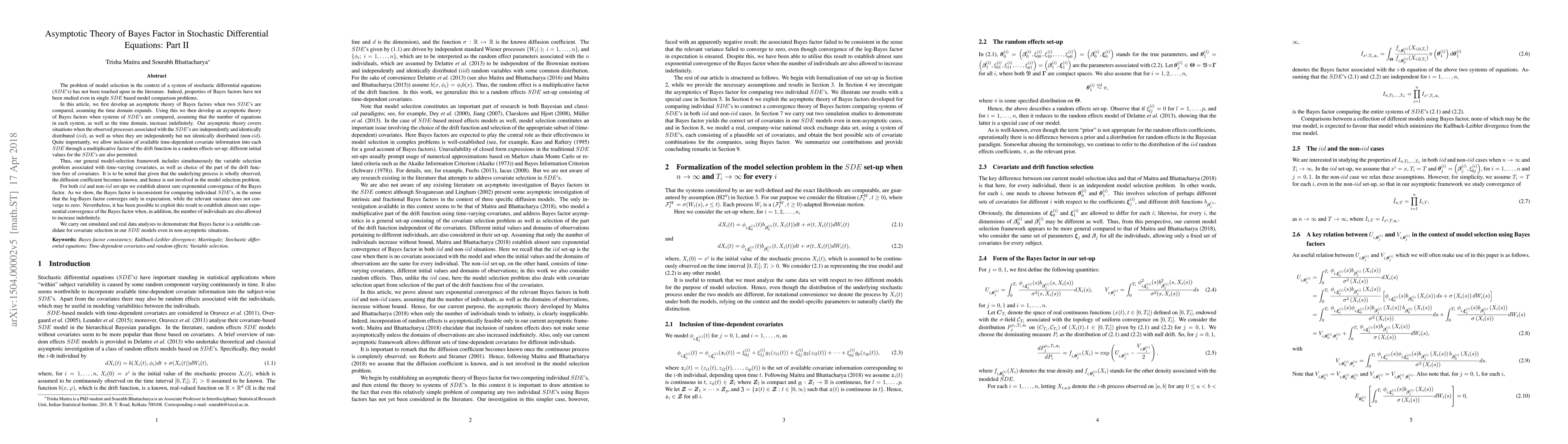 This paper develops an asymptotic theory for Bayes factors in the context of comparing systems of stochastic differential equations (SDEs). It shows that while the Bayes factor is inconsistent for individual SDEs, it converges almost surely when the number of individuals also increases indefinitely, making it suitable for model selection, including variable selection for time-varying covariates.