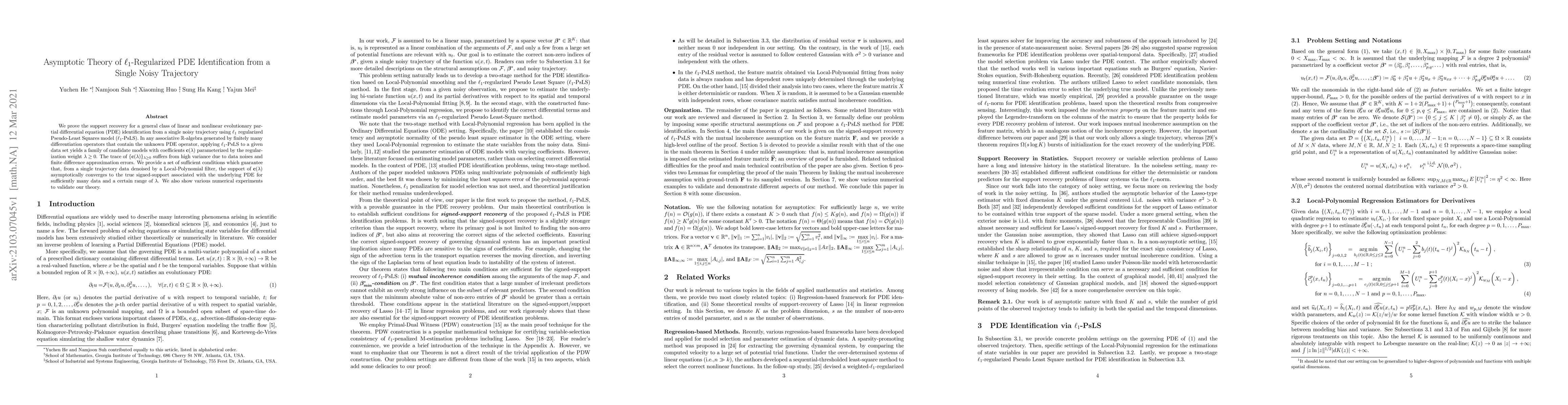 We prove the support recovery for a general class of linear and nonlinear evolutionary partial differential equation (PDE) identification from a single noisy trajectory using $\ell_1$ regularized Pseudo-Least Squares model~($\ell_1$-PsLS). In any associative $\mathbb{R}$-algebra generated by finitely many differentiation operators that contain the unknown PDE operator, applying $\ell_1$-PsLS to a given data set yields a family of candidate models with coefficients $\mathbf{c}(\lambda)$ parameterized by the regularization weight $\lambda\geq 0$. The trace of $\{\mathbf{c}(\lambda)\}_{\lambda\geq 0}$ suffers from high variance due to data noises and finite difference approximation errors. We provide a set of sufficient conditions which guarantee that, from a single trajectory data denoised by a Local-Polynomial filter, the support of $\mathbf{c}(\lambda)$ asymptotically converges to the true signed-support associated with the underlying PDE for sufficiently many data and a certain range of $\lambda$. We also show various numerical experiments to validate our theory.