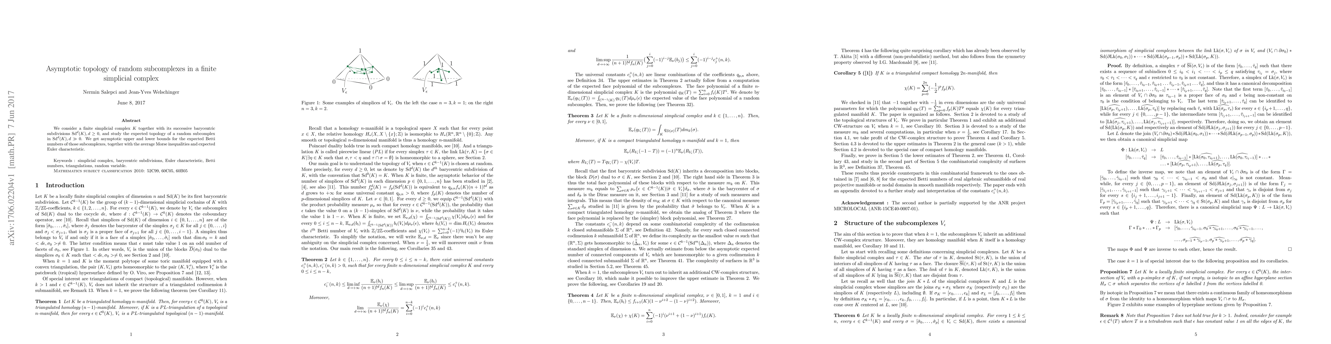 This research paper investigates the expected topology of random subcomplexes in a finite simplicial complex, providing asymptotic upper and lower bounds for Betti numbers, average Morse inequalities, and expected Euler characteristic as the subdivision level increases.