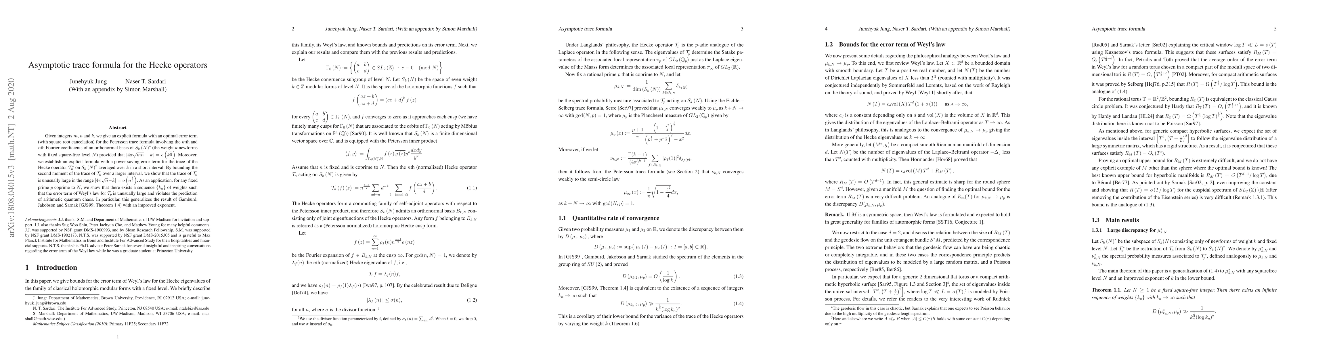 Given integers $m$, $n$ and $k$, we give an explicit formula with an optimal error term (with square root cancelation) for the Petersson trace formula involving the $m$-th and $n$-th Fourier coefficients of an orthonormal basis of $S_k(N)^*$ (the weight $k$ newforms with fixed square-free level $N$) provided that $|4 \pi \sqrt{mn}- k|=o(k^{\frac{1}{3}})$. Moreover, we establish an explicit formula with a power saving error term for the trace of the Hecke operator $\mathcal{T}_n^*$ on $S_k(N)^*$ averaged over $k$ in a short interval. By bounding the second moment of the trace of $\mathcal{T}_{n}$ over a larger interval, we show that the trace of $\mathcal{T}_n$ is unusually large in the range $|4 \pi \sqrt{n}- k| = o(n^{\frac{1}{6}})$. As an application, for any fixed prime $p$ with $\gcd(p,N)=1$, we show that there exists a sequence $\{k_n\}$ of weights such that the error term of Weyl's law for $\mathcal{T}_p$ is unusually large and violates the prediction of arithmetic quantum chaos. In particular, this generalizes the result of Gamburd, Jakobson and Sarnak~\cite[Theorem 1.4]{Gamburd} with an improved exponent.