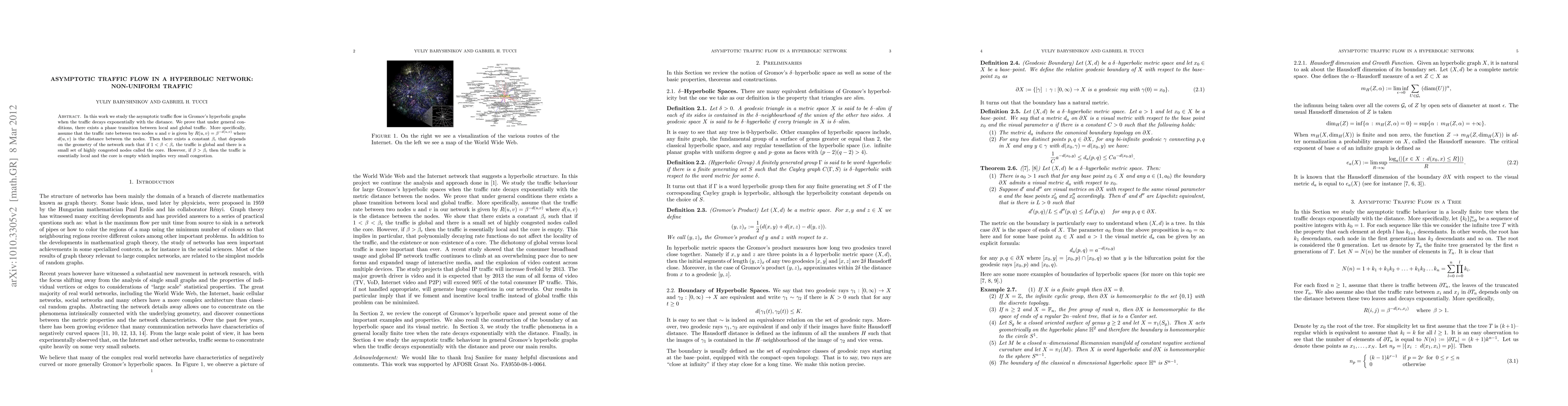 This paper investigates the asymptotic traffic flow in hyperbolic networks where traffic decays exponentially with distance. It demonstrates a phase transition between local and global traffic, showing that below a critical threshold, traffic is global with a congested core, while above it, traffic becomes local with minimal congestion.