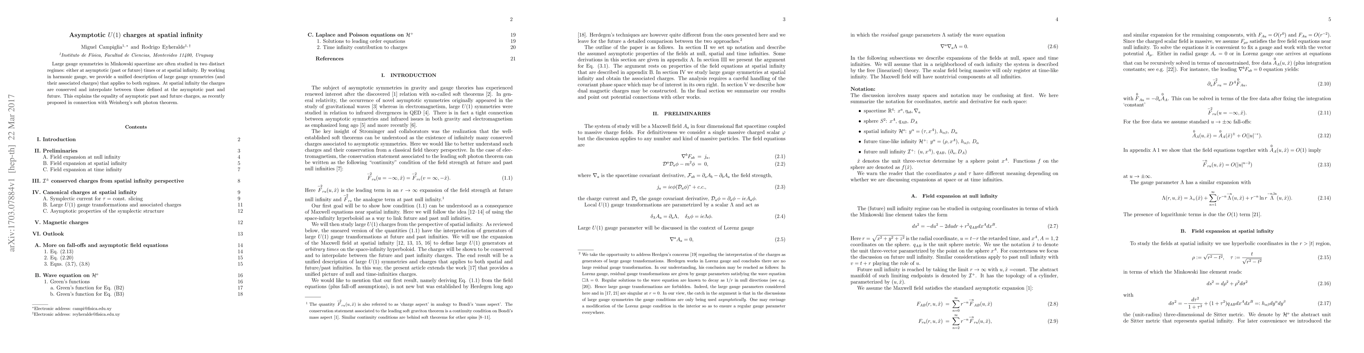 Large gauge symmetries in Minkowski spacetime are often studied in two distinct regimes: either at asymptotic (past or future) times or at spatial infinity. By working in harmonic gauge, we provide a unified description of large gauge symmetries (and their associated charges) that applies to both regimes. At spatial infinity the charges are conserved and interpolate between those defined at the asymptotic past and future. This explains the equality of asymptotic past and future charges, as recently proposed in connection with Weinberg's soft photon theorem.