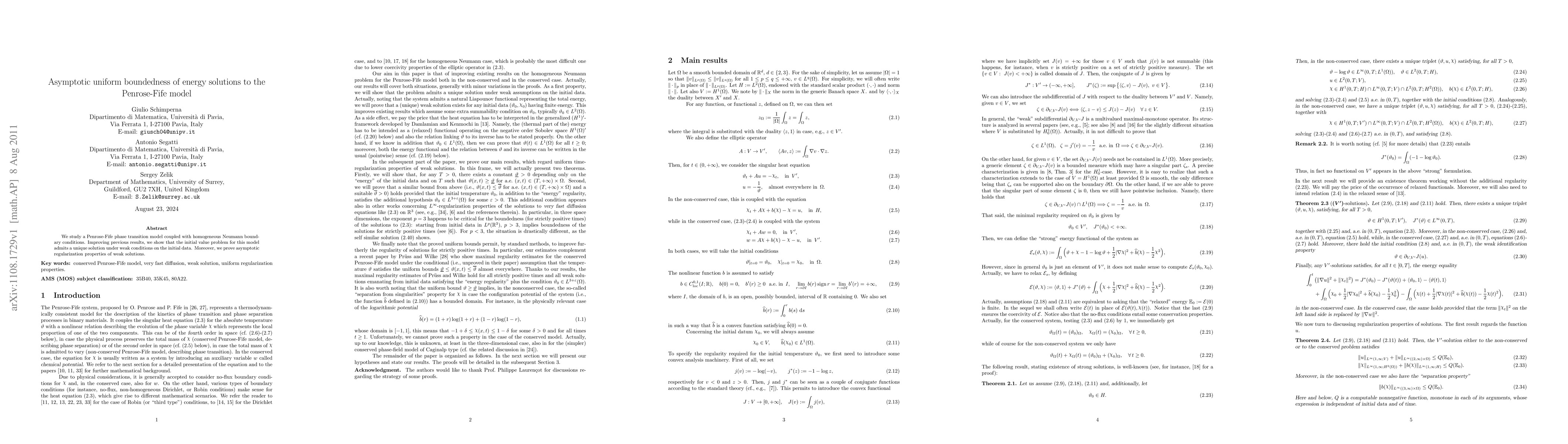 Researchers have shown that a phase transition model exhibits asymptotic uniform boundedness of energy solutions under weak conditions on initial data, providing unique solution existence and regularization properties for the model.