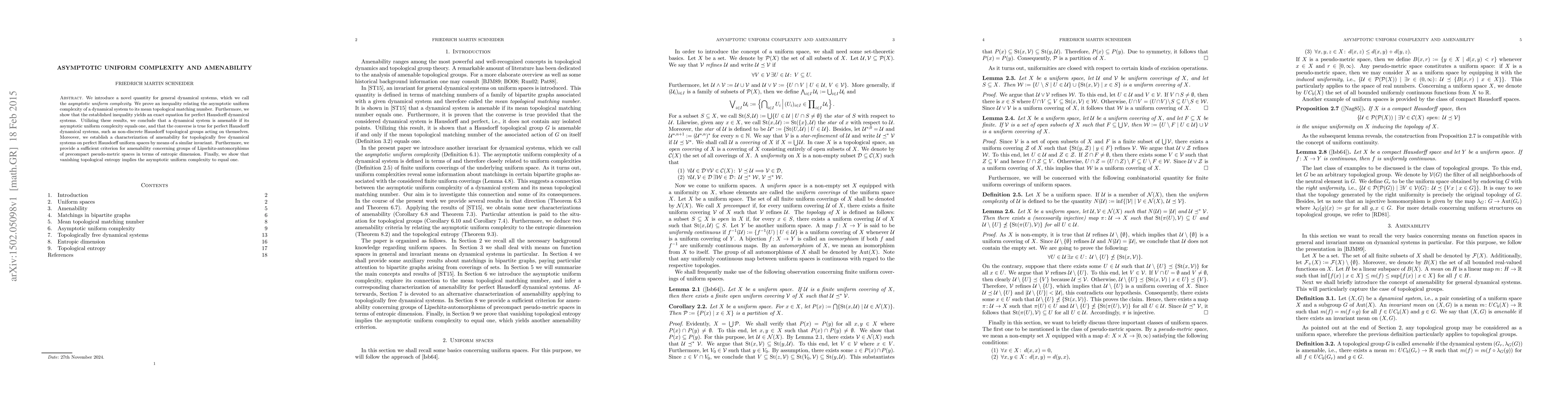 We introduce a novel quantity for general dynamical systems, which we call the asymptotic uniform complexity. We prove an inequality relating the asymptotic uniform complexity of a dynamical system to its mean topological matching number. Furthermore, we show that the established inequality yields an exact equation for perfect Hausdorff dynamical systems. Utilizing these results, we conclude that a dynamical system is amenable if its asymptotic uniform complexity equals one, and that the converse is true for perfect Hausdorff dynamical systems, such as non-discrete Hausdorff topological groups acting on themselves. Moreover, we establish a characterization of amenability for topologically free dynamical systems on perfect Hausdorff uniform spaces by means of a similar invariant. Furthermore, we provide a sufficient criterion for amenability concerning groups of Lipschitz-automorphisms of precompact pseudo-metric spaces in terms of entropic dimension. Finally, we show that vanishing topological entropy implies the asymptotic uniform complexity to equal one.