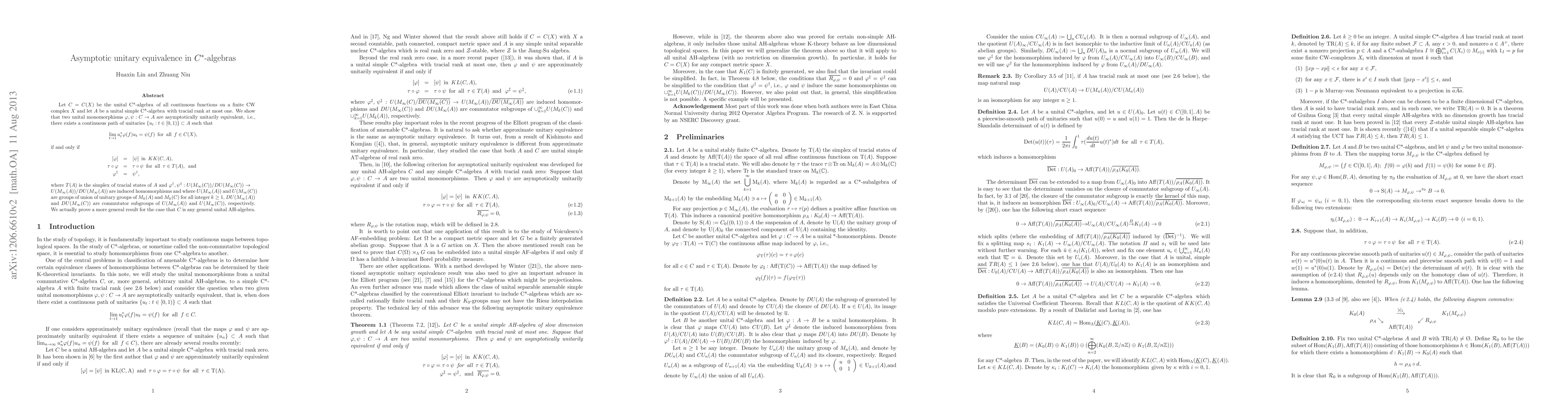 Let $C=C(X)$ be the unital $C^*$-algebra of all continuous functions on a finite CW complex $X$ and let $A$ be a unital simple $C^*$-algebra with tracial rank at most one. We show that two unital monomorphisms $\phi, \psi: C\to A$ are asymptotically unitarily equivalent, i.e., there exists a continuous path of unitaries $\{u_t: t\in [0,1)\}\subset A$ such that $$ \lim_{t\to 1} u_t^*\phi(f)u_t=\psi(f) {\rm for all} \in C(X), $$ if and only if \beq [\phi]&=&[\psi] {\rm in} KK(C, A), \tau\circ \phi&=&\tau\circ \psi {\rm for all} \tau\in T(A), and \phi^{\dag}&=&\psi^{\dag}, \eneq where $T(A)$ is the simplex of tracial states of $A$ and $\phi^{\dag}, \psi^{\dag}: U(M_{\infty}(C))/DU(M_{\infty}(C))\to$ $U(M_{\infty}(A))/DU(M_{\infty}(A))$ are induced homomorphisms and where $U(M_{\infty}(A))$ and $U(M_{\infty}(C))$ are groups of union of unitary groups of $M_k(A)$ and $M_k(C)$ for all integer $k\ge 1,$ $DU(M_{\infty}(A))$ and $DU(M_{\infty}(C))$ are commutator subgroups of $U(M_{\infty}(A))$ and $U(M_{\infty}(C)),$ respectively. We actually prove a more general result for the case that $C$ is any general unital AH-algebra.