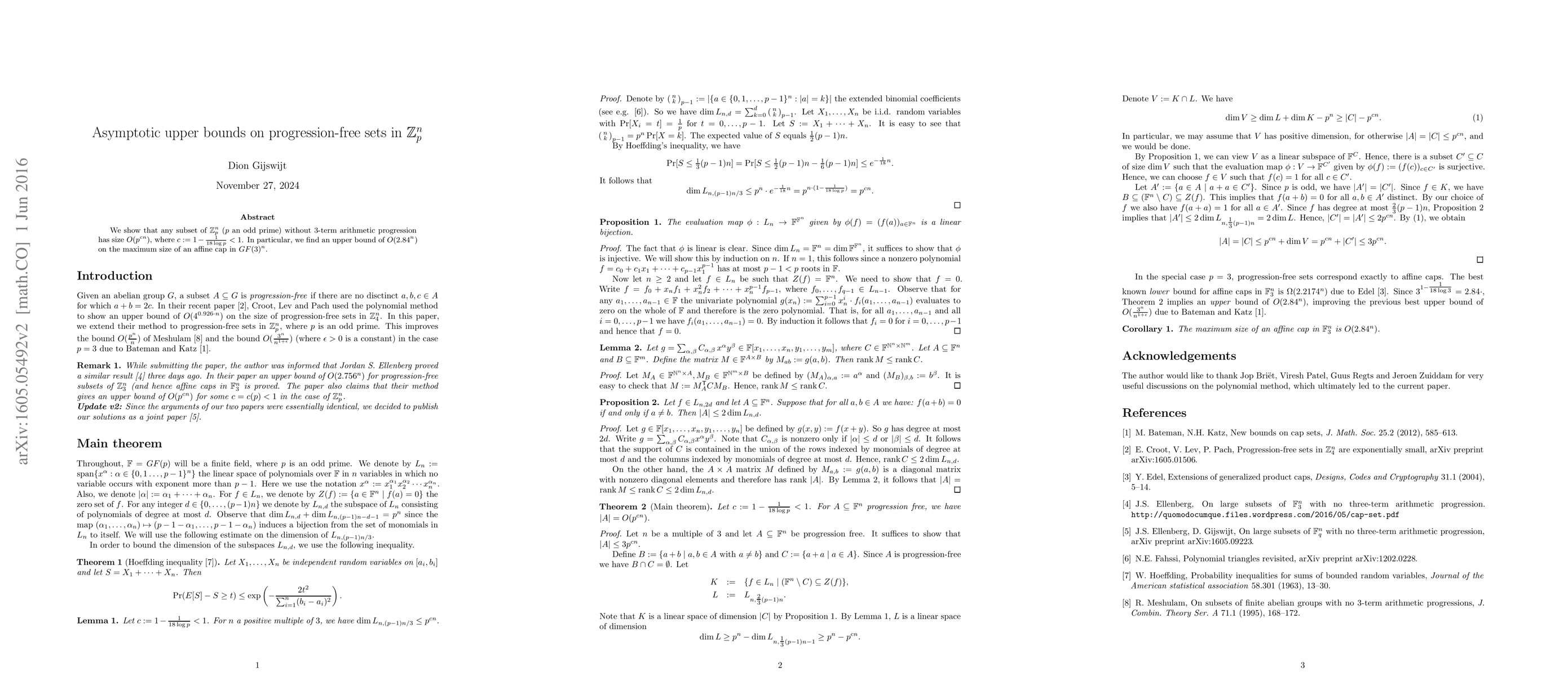 This paper establishes an asymptotic upper bound of $O(p^{cn})$ for subsets of $\mathbb{Z}_p^n$ devoid of 3-term arithmetic progressions, with $c<1$. Specifically, it finds an upper bound of $O(2.84^n)$ for the largest affine cap in $GF(3)^n$.