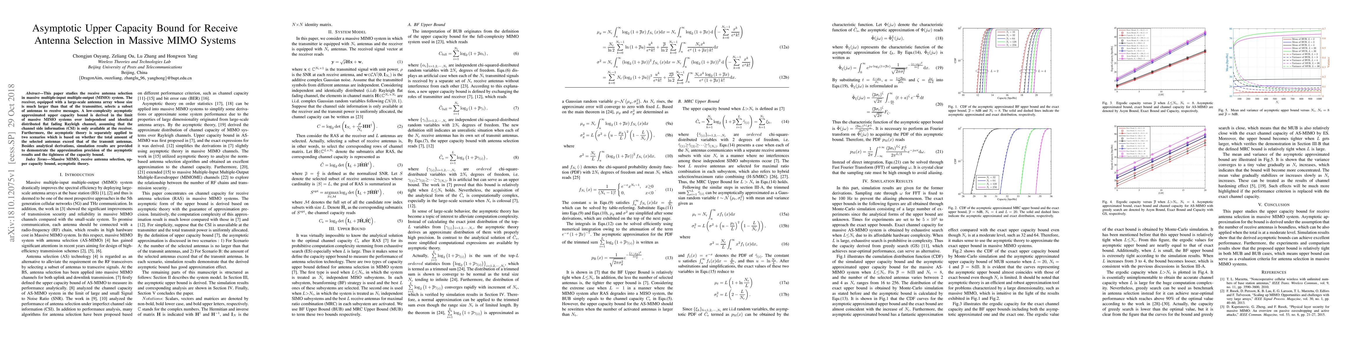 This paper derives a low-complexity asymptotic upper capacity bound for receive antenna selection in massive MIMO systems, focusing on scenarios with varying numbers of selected antennas relative to transmit antennas. Simulation results validate the approximation precision and the tightness of the derived capacity bound.