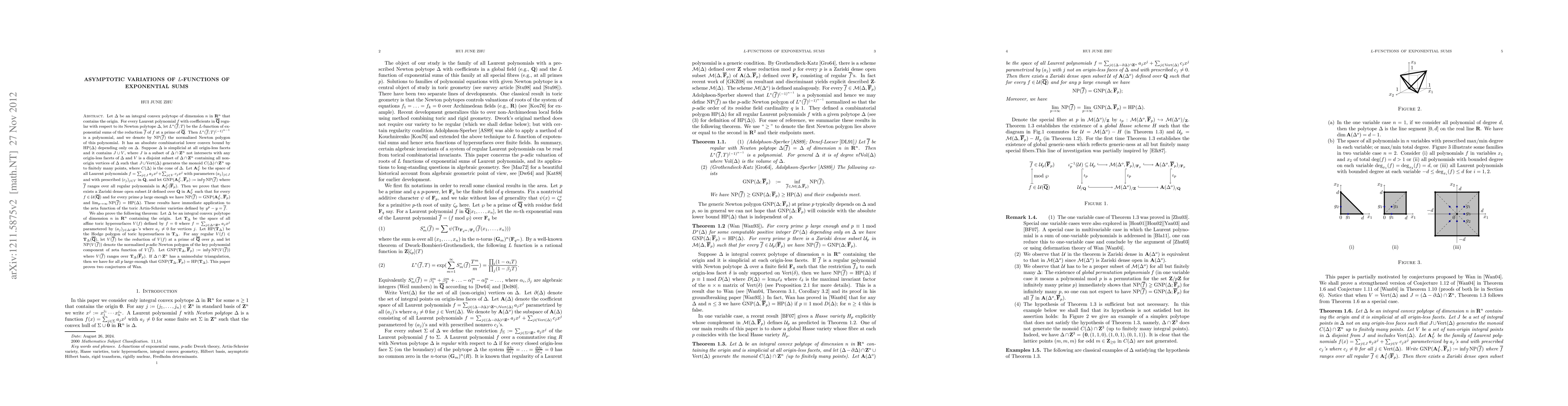 Let Delta be an integral convex polytope containing the origin of dimension n in the n-dim real space and it is simplicial at all origin-less facets. Let A(Delta) be the space of all Laurent polynomials f parametered by its coefficients supported on the interior of Delta with with prescribed vertices. In this paper we prove that, if the interior points of Delta and its vertices generate almost all integral points in the cone of Delta, then there is a Zariski dense open subset U in A(Delta) defined over the rationals such that for every f in U(bar{Q}) and for p large enough the Newton polygon of the L function of exponential sum of f is equal to the generic Newton polygon for A(Delta)(bar{F_p}), and as p approaches infinity they both approach an absolute lower bound depending only on Delta. This paper also proves the following result for affine toric hypersurfaces: Let T_Delta be the space of all regular affine toric hypersurfaces given by f=0 for all Laurent polynomials f with given Newton polytope Delta. If the set of all integral points in Delta has a unimodular triangulation, then for p large enough the generic Newton polygon of T_Delta over bar{F_p} coincides with the Hodge polygon defined in terms of Hodge numbers of the toric family T_Delta determined solely by Delta.