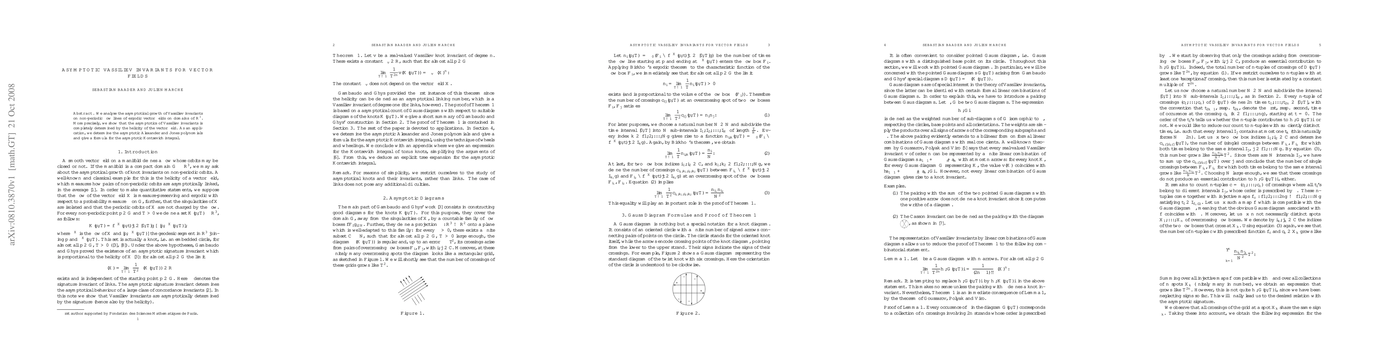 This paper investigates the asymptotic behavior of Vassiliev invariants along non-periodic flow lines of ergodic vector fields in $\R^3$, demonstrating that this behavior is dictated by the vector field's helicity. It also derives formulas for asymptotic Alexander, Jones polynomials, and the Kontsevich integral.