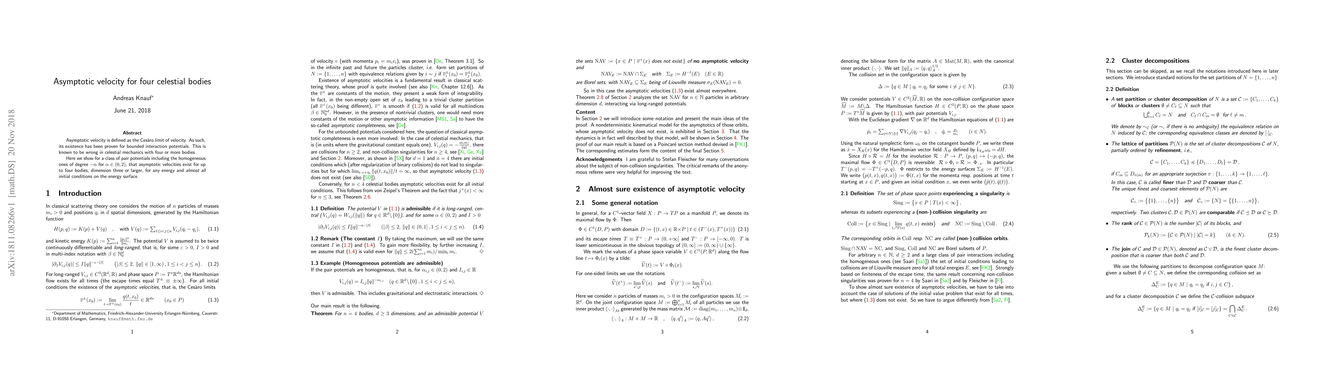 Asymptotic velocity is defined as the Ces\`aro limit of velocity. As such, its existence has been proven for bounded interaction potentials. This is known to be wrong in celestial mechanics with four or more bodies. Here we show for a class of pair potentials including the homogeneous ones of degree -a for 0