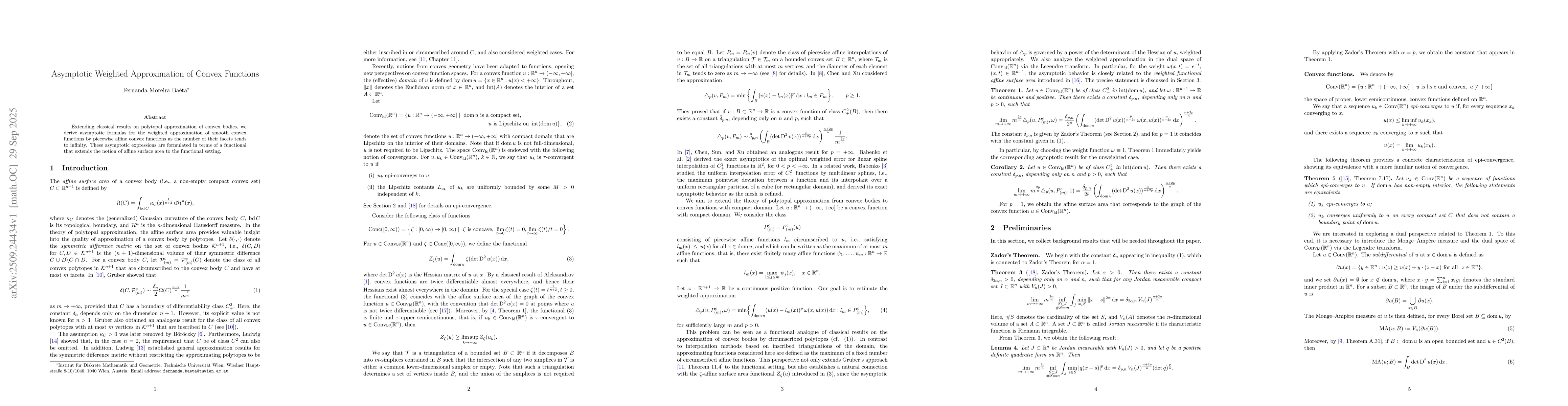 The research employs asymptotic analysis and functional approximation techniques to study the weighted approximation of smooth convex functions by piecewise affine convex functions. It utilizes tools from convex geometry, including support functions, Monge-Ampère measures, and Legendre transforms, combined with variational methods and integral estimates.