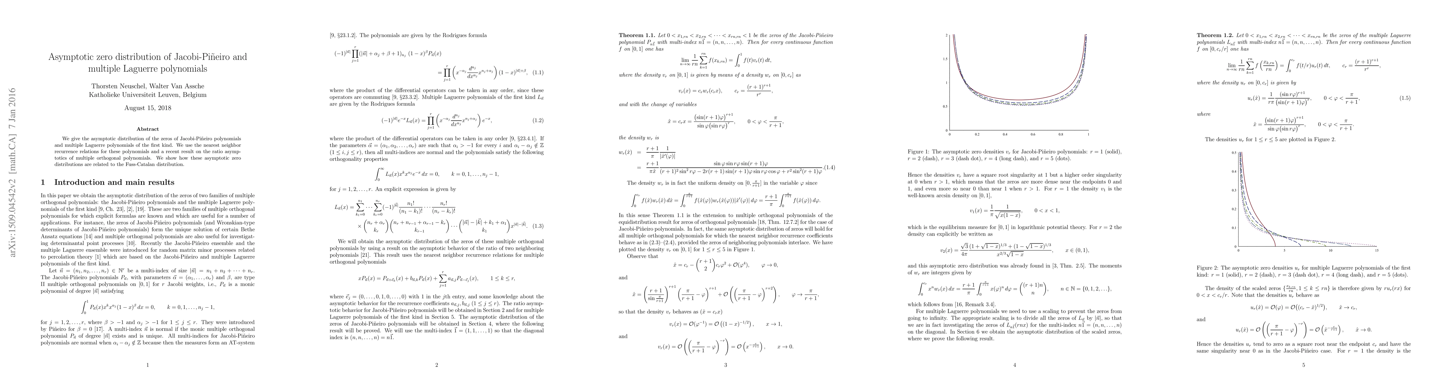 We give the asymptotic distribution of the zeros of Jacobi-Pi\~neiro polynomials and multiple Laguerre polynomials of the first kind. We use the nearest neighbor recurrence relations for these polynomials and a recent result on the ratio asymptotics of multiple orthogonal polynomials. We show how these asymptotic zero distributions are related to the Fuss-Catalan distribution.