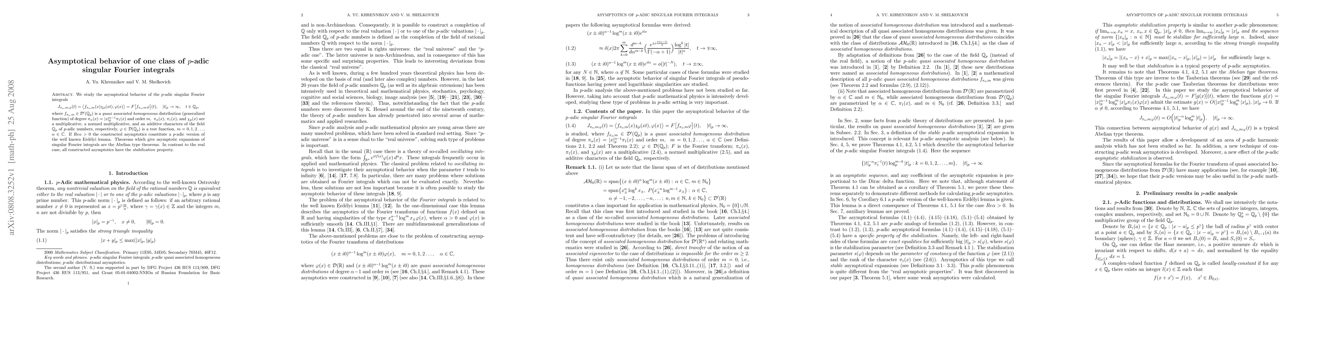 We study the asymptotical behavior of the $p$-adic singular Fourier integrals $$ J_{\pi_{\alpha},m;\phi}(t) =\bigl< f_{\pi_{\alpha};m}(x)\chi_p(xt), \phi(x)\bigr> =F\big[f_{\pi_{\alpha};m}\phi\big](t), \quad |t|_p \to \infty, \quad t\in \bQ_p, $$ where $f_{\pi_{\alpha};m}\in {\cD}'(\bQ_p)$ is a {\em quasi associated homogeneous} distribution (generalized function) of degree $\pi_{\alpha}(x)=|x|_p^{\alpha-1}\pi_1(x)$ and order $m$, $\pi_{\alpha}(x)$, $\pi_1(x)$, and $\chi_p(x)$ are a multiplicative, a normed multiplicative, and an additive characters of the field $\bQ_p$ of $p$-adic numbers, respectively, $\phi \in {\cD}(\bQ_p)$ is a test function, $m=0,1,2...$, $\alpha\in \bC$. If $Re\alpha>0$ the constructed asymptotics constitute a $p$-adic version of the well known Erd\'elyi lemma. Theorems which give asymptotic expansions of singular Fourier integrals are the Abelian type theorems. In contrast to the real case, all constructed asymptotics have the {\it stabilization} property.