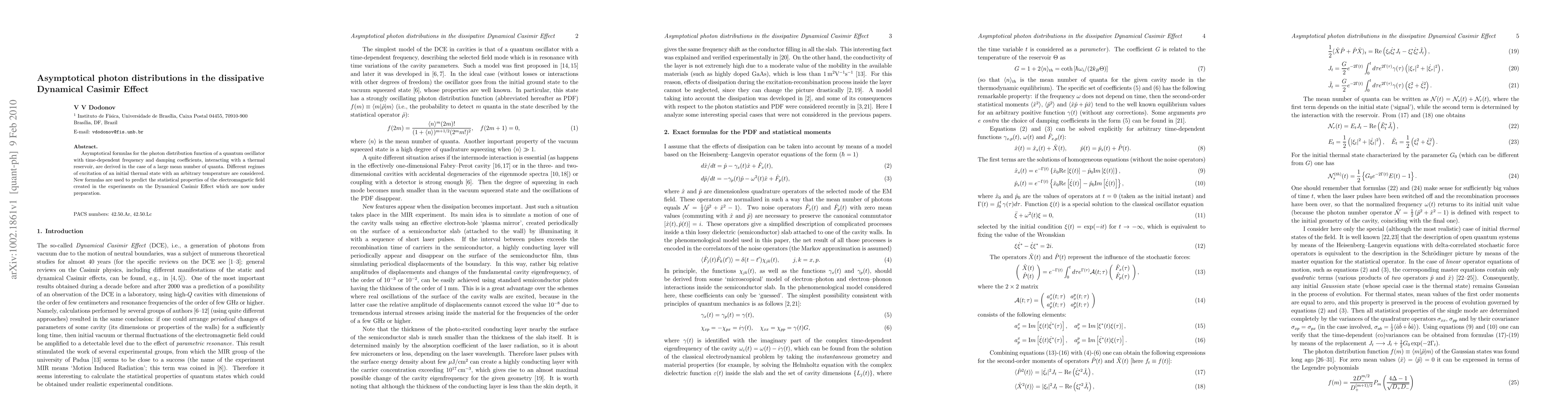 This paper derives asymptotic formulas for photon distributions in a quantum oscillator with time-dependent frequency and damping, interacting with a thermal reservoir. These new formulas predict the statistical properties of electromagnetic fields in experiments studying the Dynamical Casimir Effect.