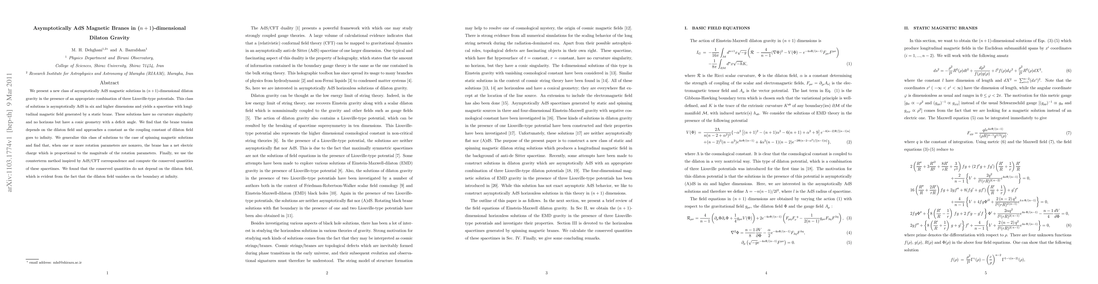 We present a new class of asymptotically AdS magnetic solutions in ($n+1$)-dimensional dilaton gravity in the presence of an appropriate combination of three Liouville-type potentials. This class of solutions is asymptotically AdS in six and higher dimensions and yields a spacetime with longitudinal magnetic field generated by a static brane. These solutions have no curvature singularity and no horizons but have a conic geometry with a deficit angle. We find that the brane tension depends on the dilaton field and approaches a constant as the coupling constant of dilaton field goes to infinity. We generalize this class of solutions to the case of spinning magnetic solutions and find that, when one or more rotation parameters are nonzero, the brane has a net electric charge which is proportional to the magnitude of the rotation parameters. Finally, we use the counterterm method inspired by AdS/CFT correspondence and compute the conserved quantities of these spacetimes. We found that the conserved quantities do not depend on the dilaton field, which is evident from the fact that the dilaton field vanishes on the boundary at infinity.