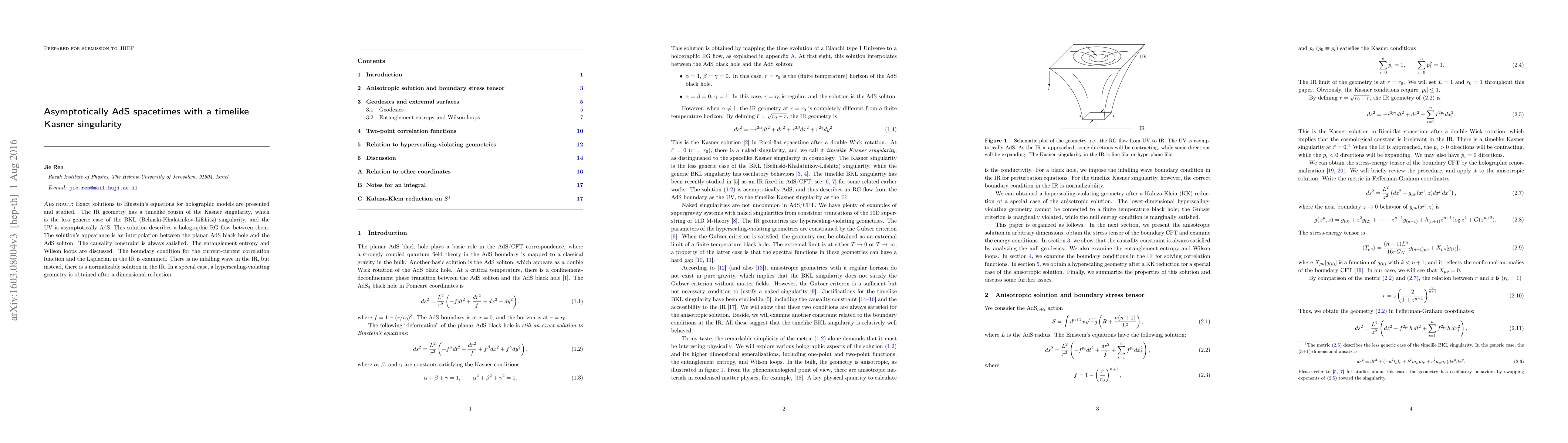 Exact solutions to Einstein's equations for holographic models are presented and studied. The IR geometry has a timelike cousin of the Kasner singularity, which is the less generic case of the BKL (Belinski-Khalatnikov-Lifshitz) singularity, and the UV is asymptotically AdS. This solution describes a holographic RG flow between them. The solution's appearance is an interpolation between the planar AdS black hole and the AdS soliton. The causality constraint is always satisfied. The entanglement entropy and Wilson loops are discussed. The boundary condition for the current-current correlation function and the Laplacian in the IR is examined. There is no infalling wave in the IR, but instead, there is a normalizable solution in the IR. In a special case, a hyperscaling-violating geometry is obtained after a dimensional reduction.