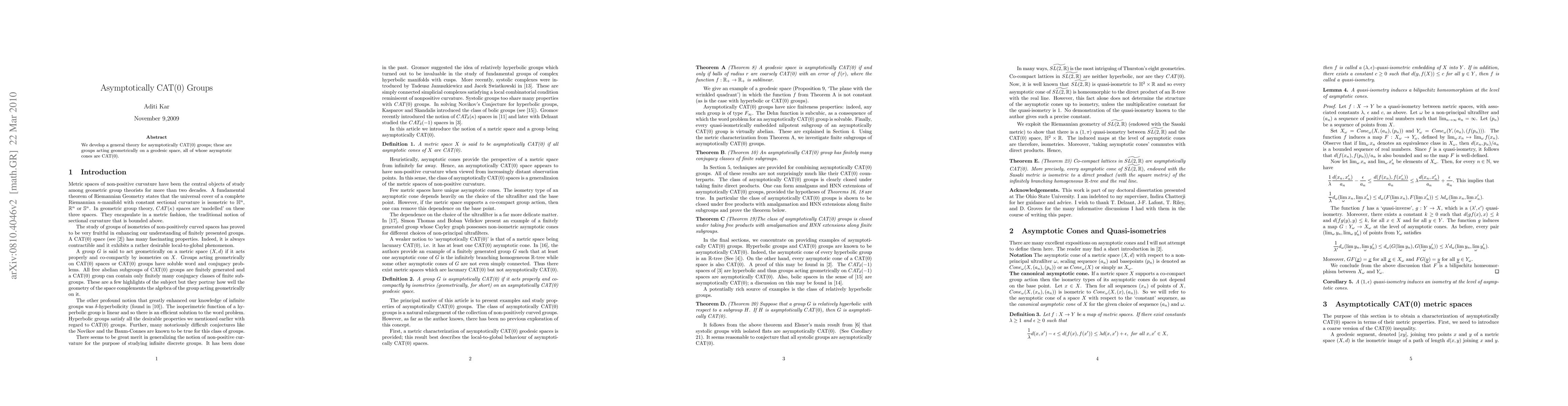 This paper explores the properties and structure of asymptotically CAT(0) groups, demonstrating their finiteness of conjugacy classes of finite subgroups, $F_\infty$ property, and solvable word problem. It also introduces methods for constructing these groups through direct products, amalgams, and HNN extensions, highlighting co-compact lattices in the universal cover of $PSL(2,\mathbb{R})$ as notable examples.