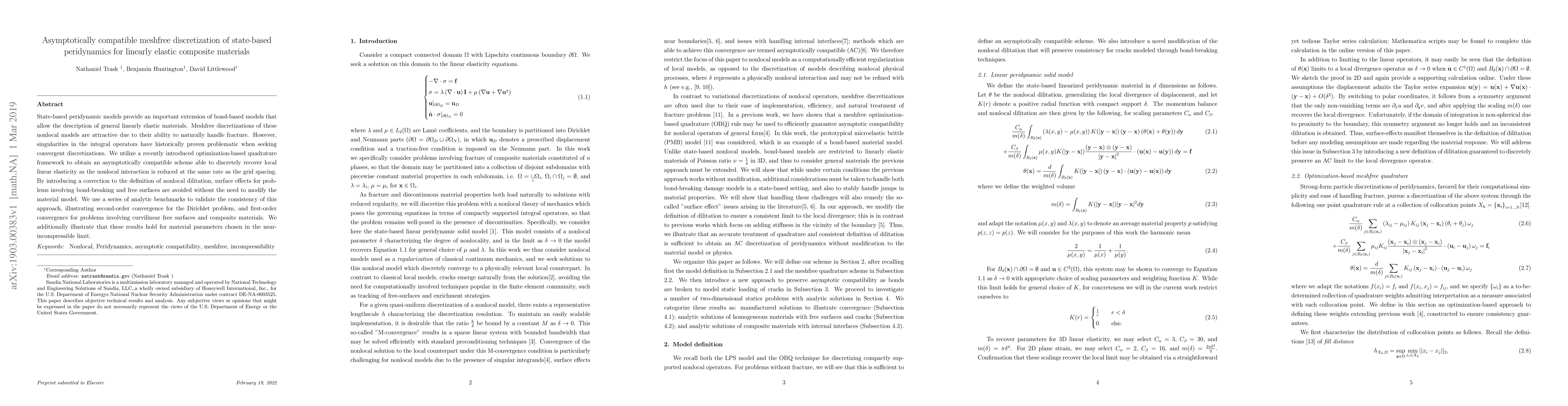 This paper presents an asymptotically compatible meshfree discretization for state-based peridynamics applied to linear elastic composites, using an optimization-based quadrature framework to address singularities. The method demonstrates second-order convergence for Dirichlet problems and first-order convergence for problems with free surfaces and composites.