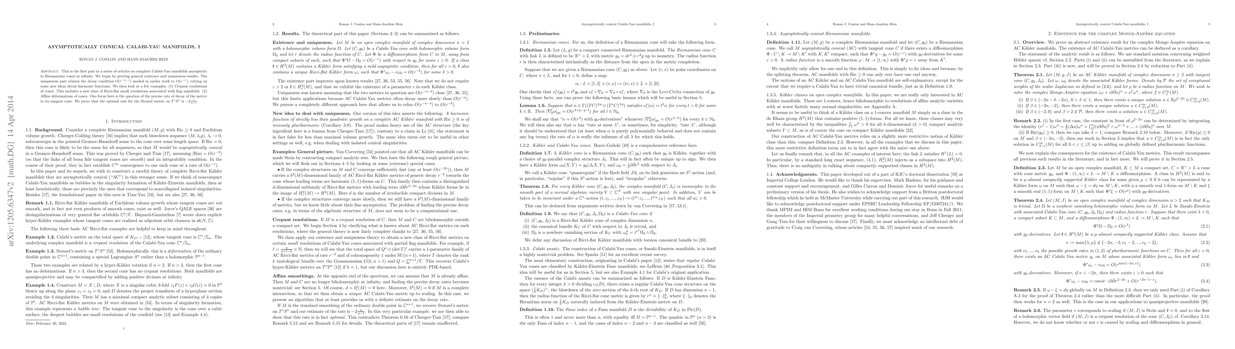 This is the first part in a two-part series on complete Calabi-Yau manifolds asymptotic to Riemannian cones at infinity. We begin by proving general existence and uniqueness results. The uniqueness part relaxes the decay condition $O(r^{-n-\epsilon})$ needed in earlier work to $O(r^{-\epsilon})$, relying on some new ideas about harmonic functions. We then look at a few examples: (1) Crepant resolutions of cones. This includes a new class of Ricci-flat small resolutions associated with flag manifolds. (2) Affine deformations of cones. One focus here is the question of the precise rate of decay of the metric to its tangent cone. We prove that the optimal rate for the Stenzel metric on $T^*S^n$ is $-2\frac{n}{n-1}$.